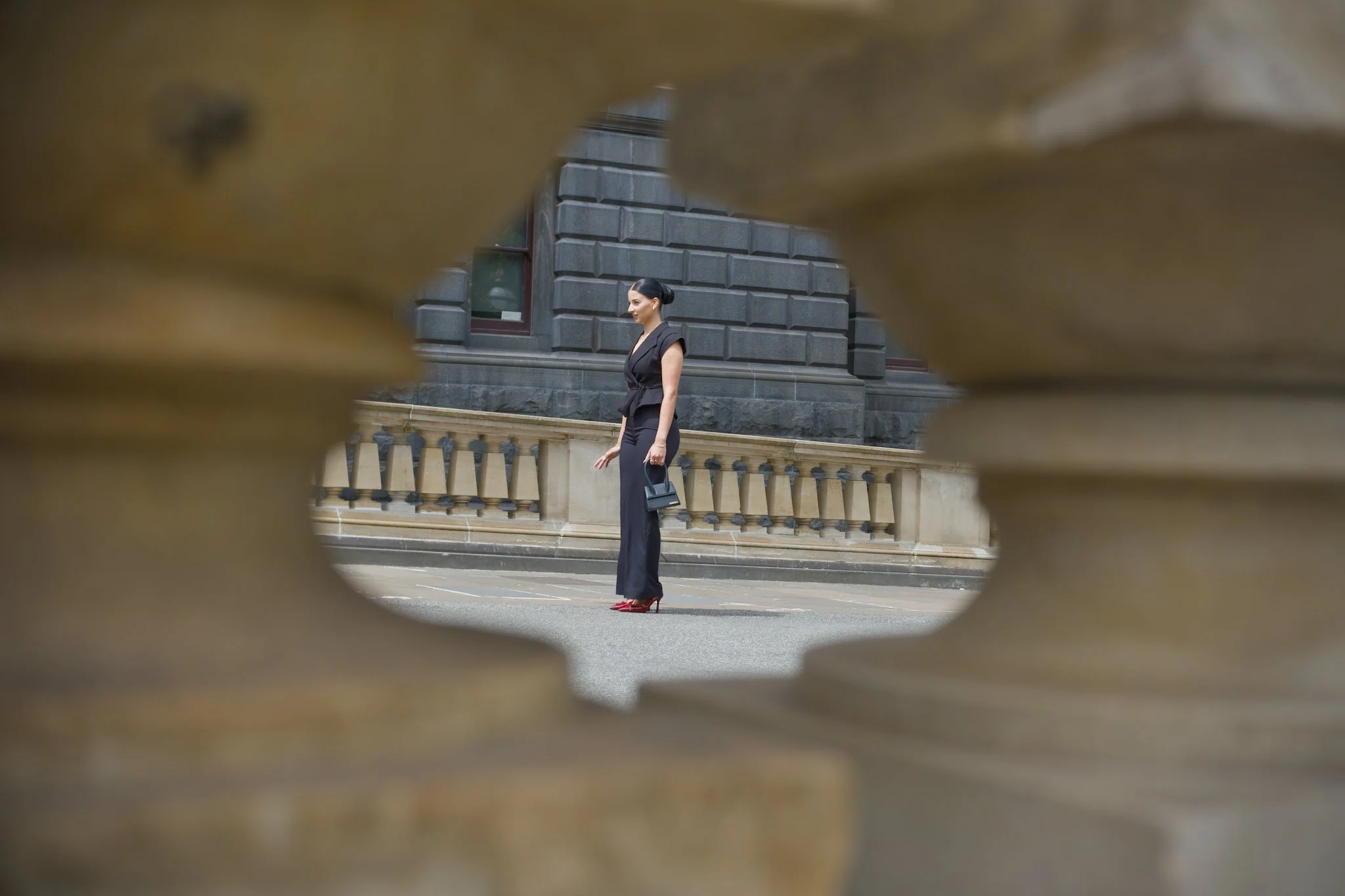 Photo of an actress in a black, formal outfit and maroon high heels standing on the inclined driveway that leads up to the steps of Parliament House in Melbourne. She is waiting for the director to call, “Action!” before walking up the driveway. This photo is taken through the gap between the pillars of the stone banister that lines the driveway.