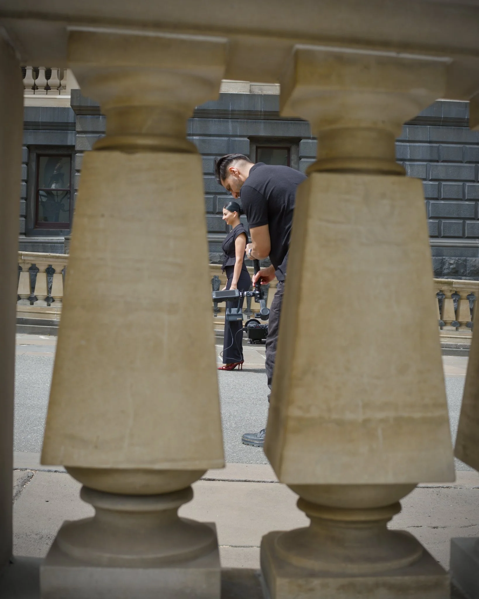 Photo of an actress in a black, formal outfit and maroon high heels standing on the inclined driveway that leads up to the steps of Parliament House in Melbourne. In the foreground is a camera operator holding his camera on a self-stabilising gimbal at knee height as he prepares to video the talent as she walks up to the building. This photo is taken through the gap between the pillars of the stone banister that lines the driveway.
