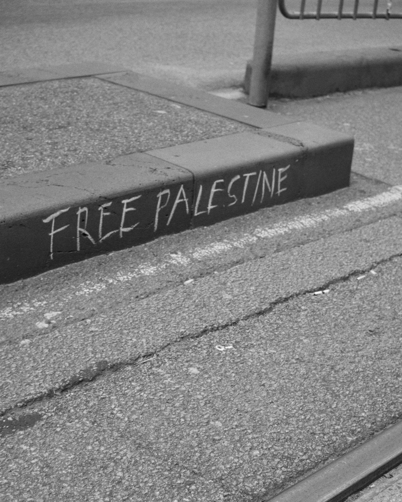Black-and-white photo of the sidewalk at a tram stop. Graffiti written in chalk on the wall of this sidewalk reads, “Free Palestine”.