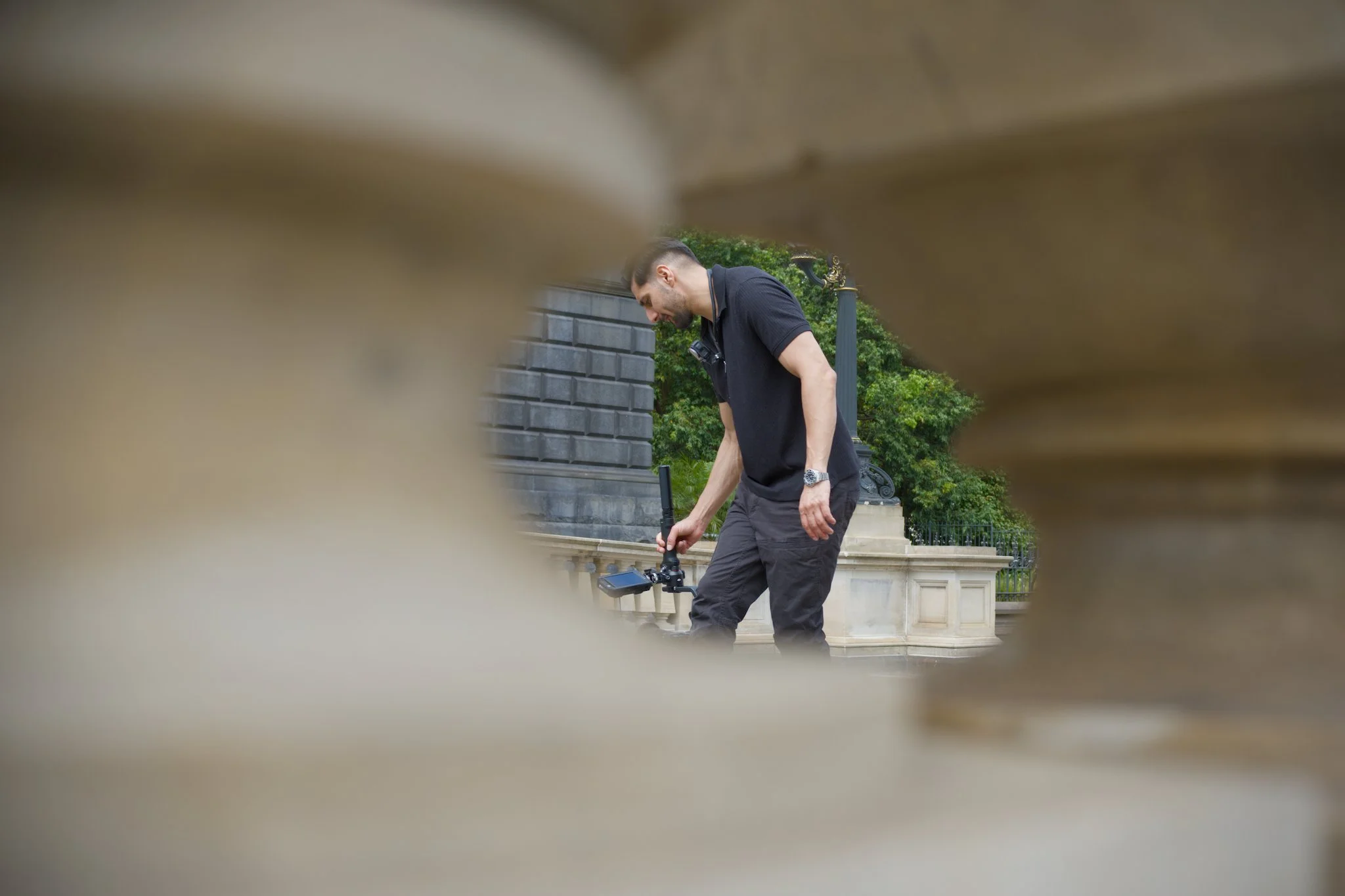 Photo of a camera operator holding his camera on a self-stabilising gimbal at knee height as he shoots his video. This photo is taken through the gap between the pillars of a stone banister.