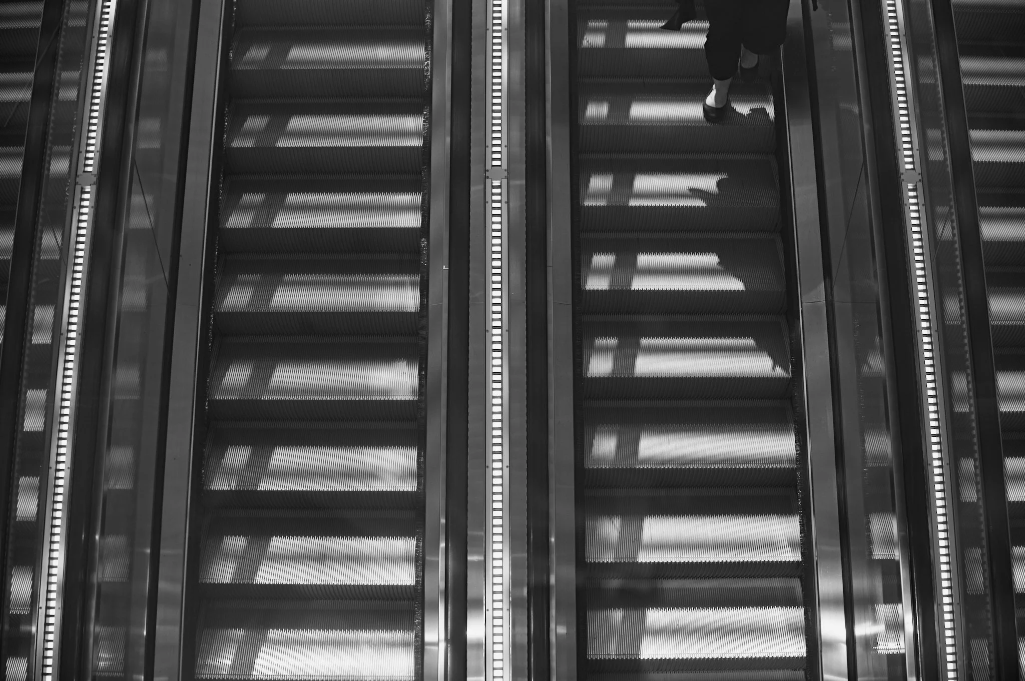 Black-and-white photo looking down at a bank of escalators leading to an underground train station. The escalators are empty, but the legs of one traveller are visible in the top-right corner of the photo.