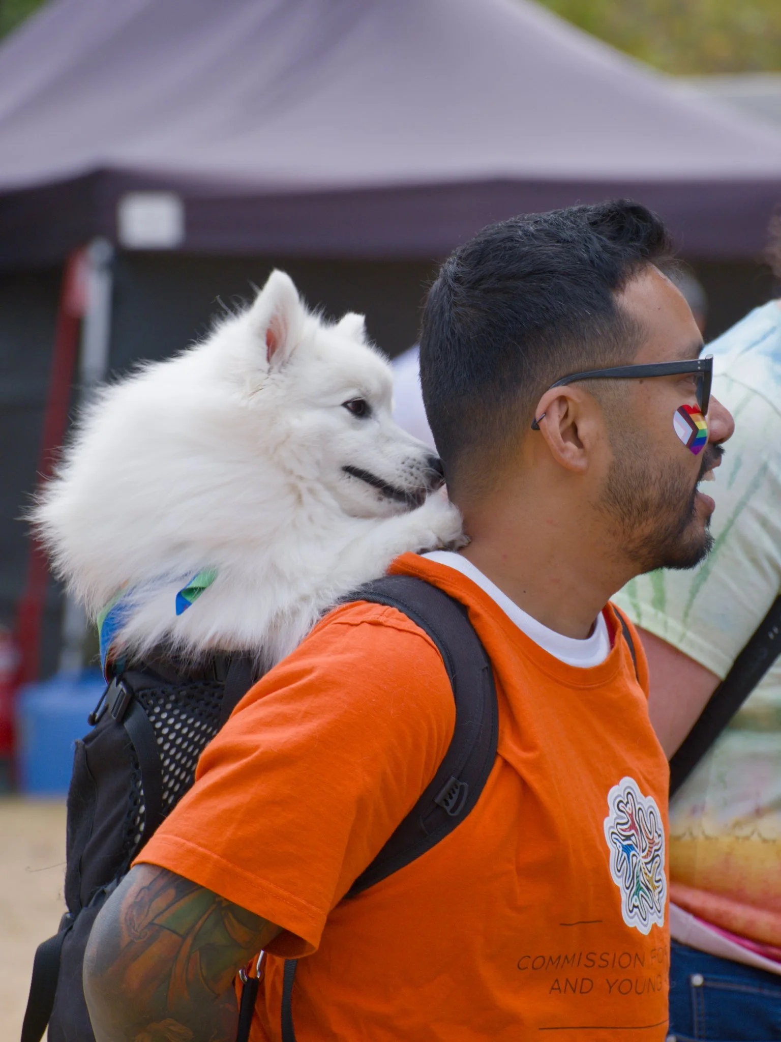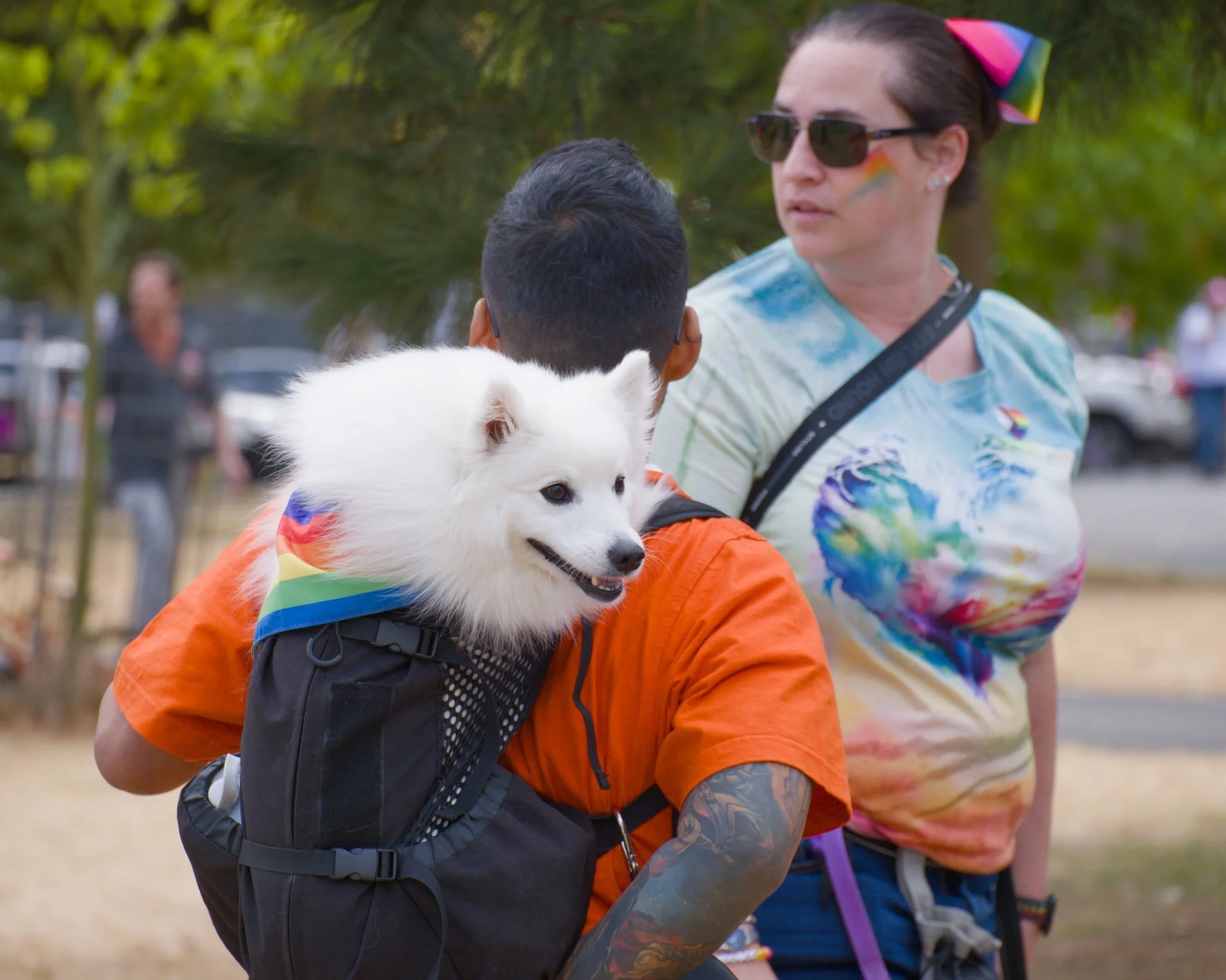 Photo of a fluffy, white, medium-sized dog in a backpack. The backpack is worn by a man in a bright orange t-shirt. Next to the man is a woman wearing a rainbow-heart-themed tie-dye t-shirt, with rainbow paint on her cheek and a rainbow hair tie.