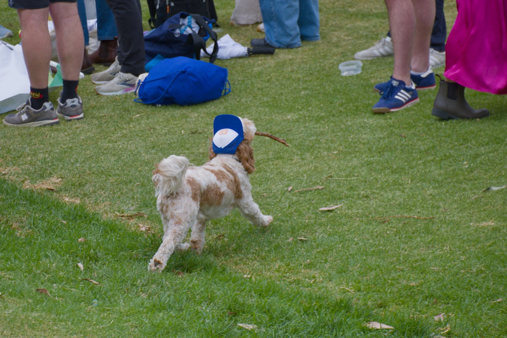 Photo of a medium-sized, brown-and-white dog wearing a baseball cap. The dog is walking across a grassy field as it carries a stick back to its owner.