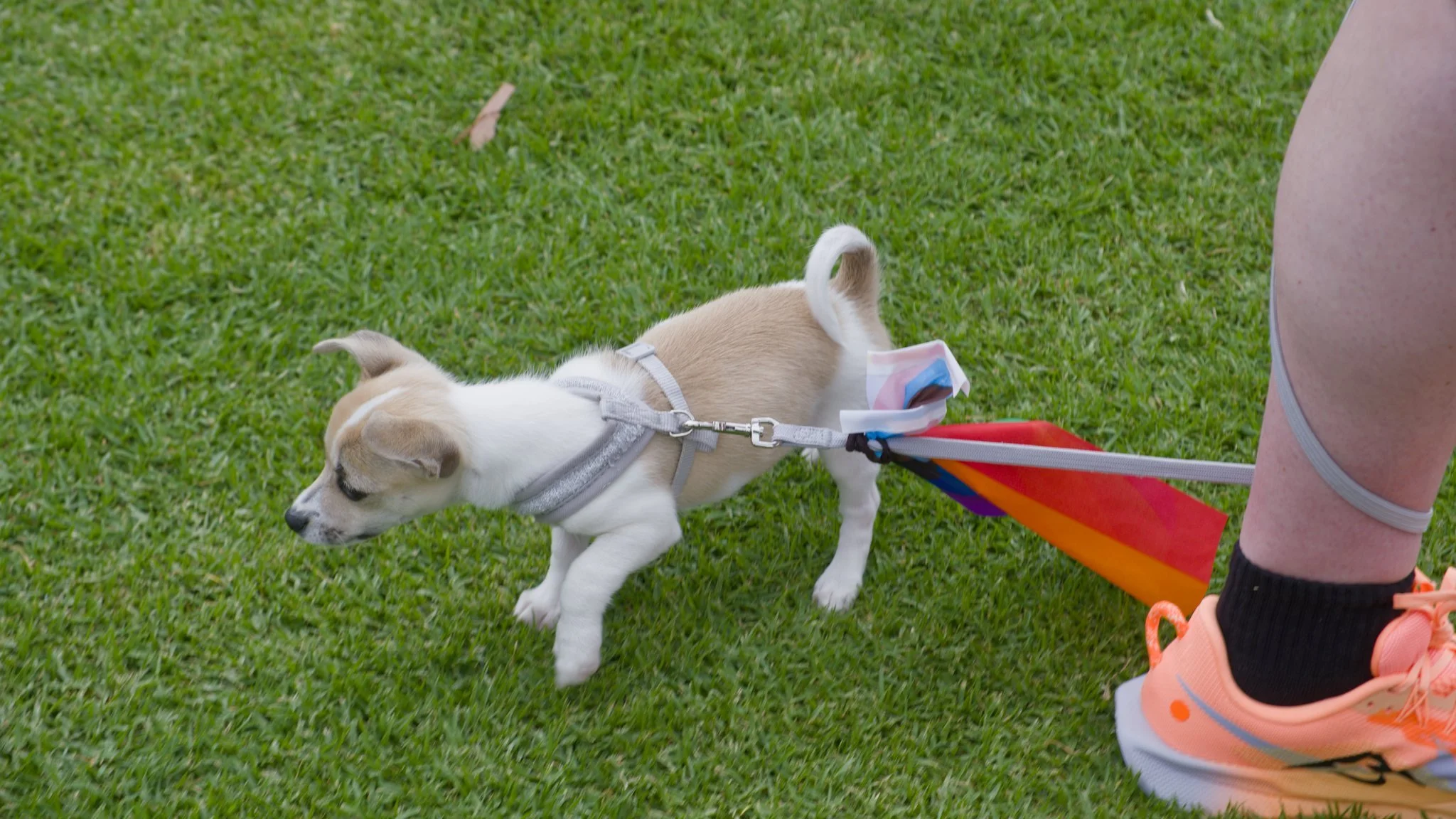 Photo of a tiny, tan-and-white puppy straining on a leash in a grassy field. The puppy is only slightly taller than the ankle of the person it is standing next to. A small Progress Pride flag has been attached to its leash.