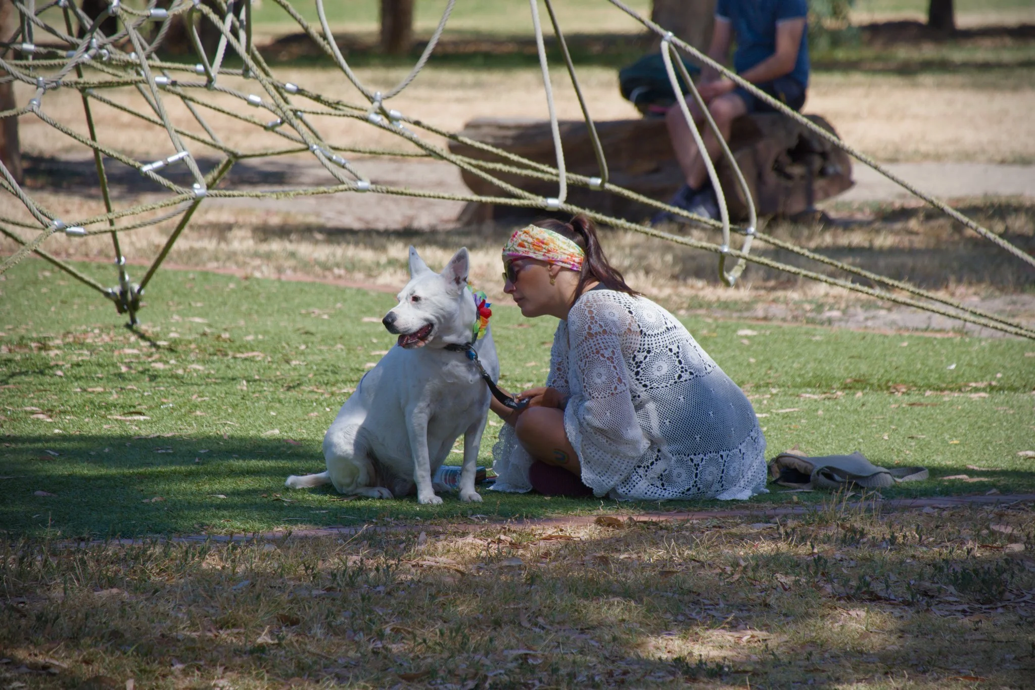 Photo of a woman and her large, white dog sitting calmly in a children's play area close to the start of Melbourne Pride March 2026. The dog is looking off-camera at the crowd of people preparing to march.