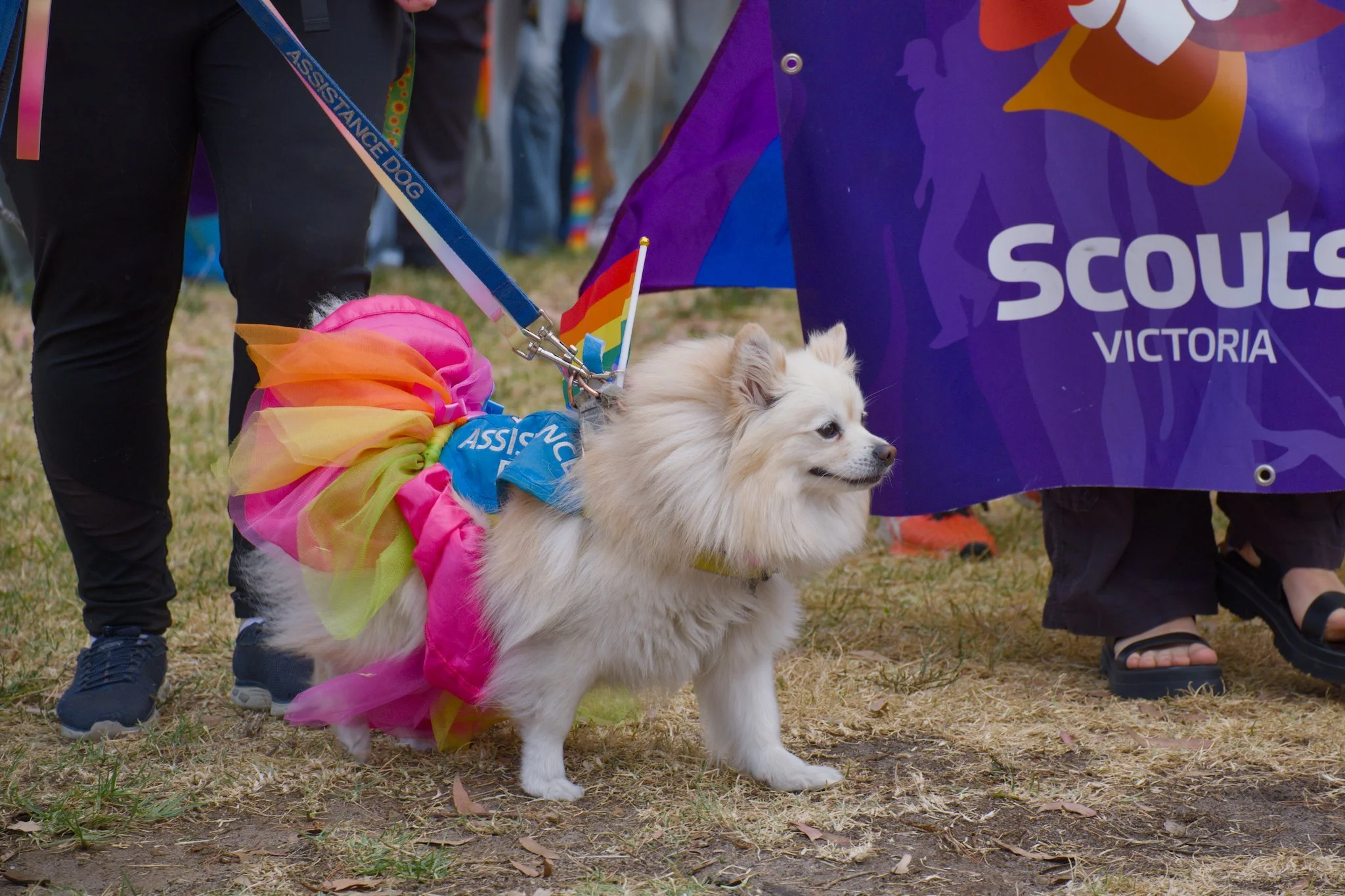 Photo of a small, fluffy, white dog wearing an assistance-dog harness and a poofy, colourful skirt. A rainbow pride flag has been attached to the dog's harness. The dog is being walked on a blue leash that has an “assistance dog” label on it. The dog and its owner are walking across a grassy field.