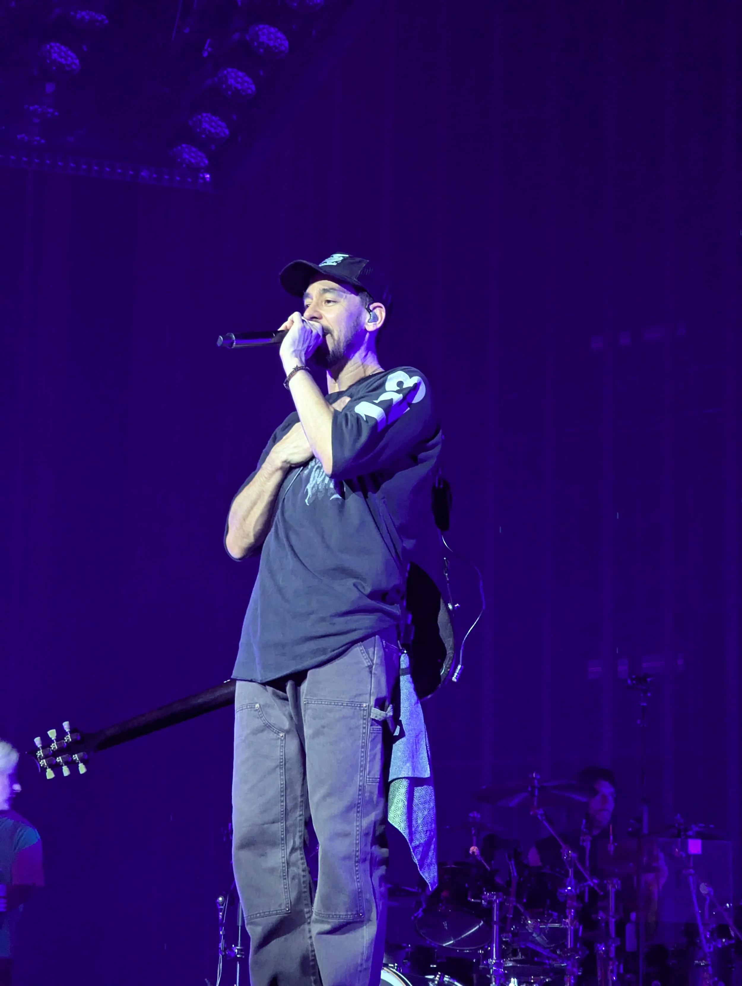 Photo of musician Mike Shinoda on stage with a guitar slung across his back while he sings into the microphone that he is holding.