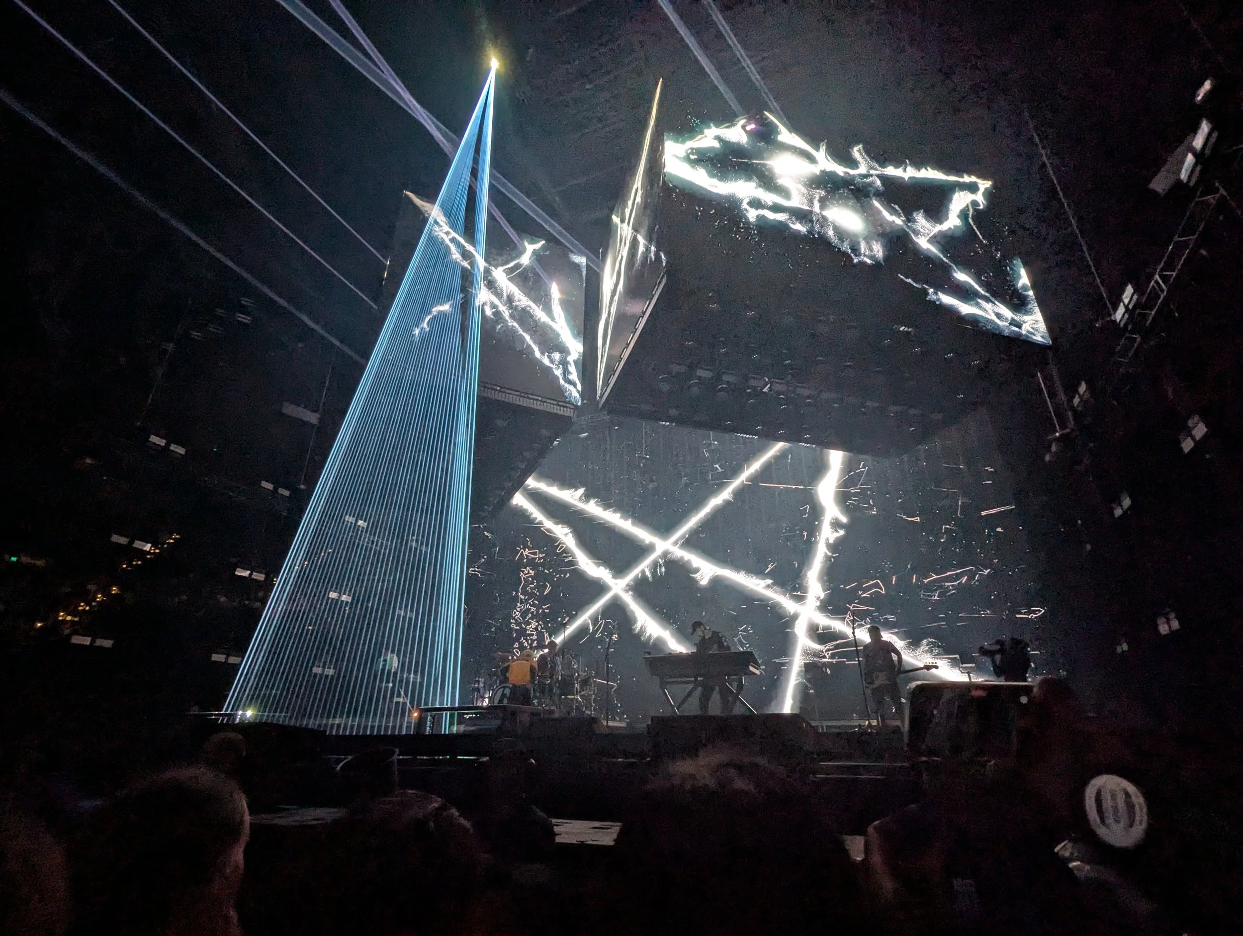 Photo of a three-dimensional laser and large-screen light show around the stage at an arena concert.