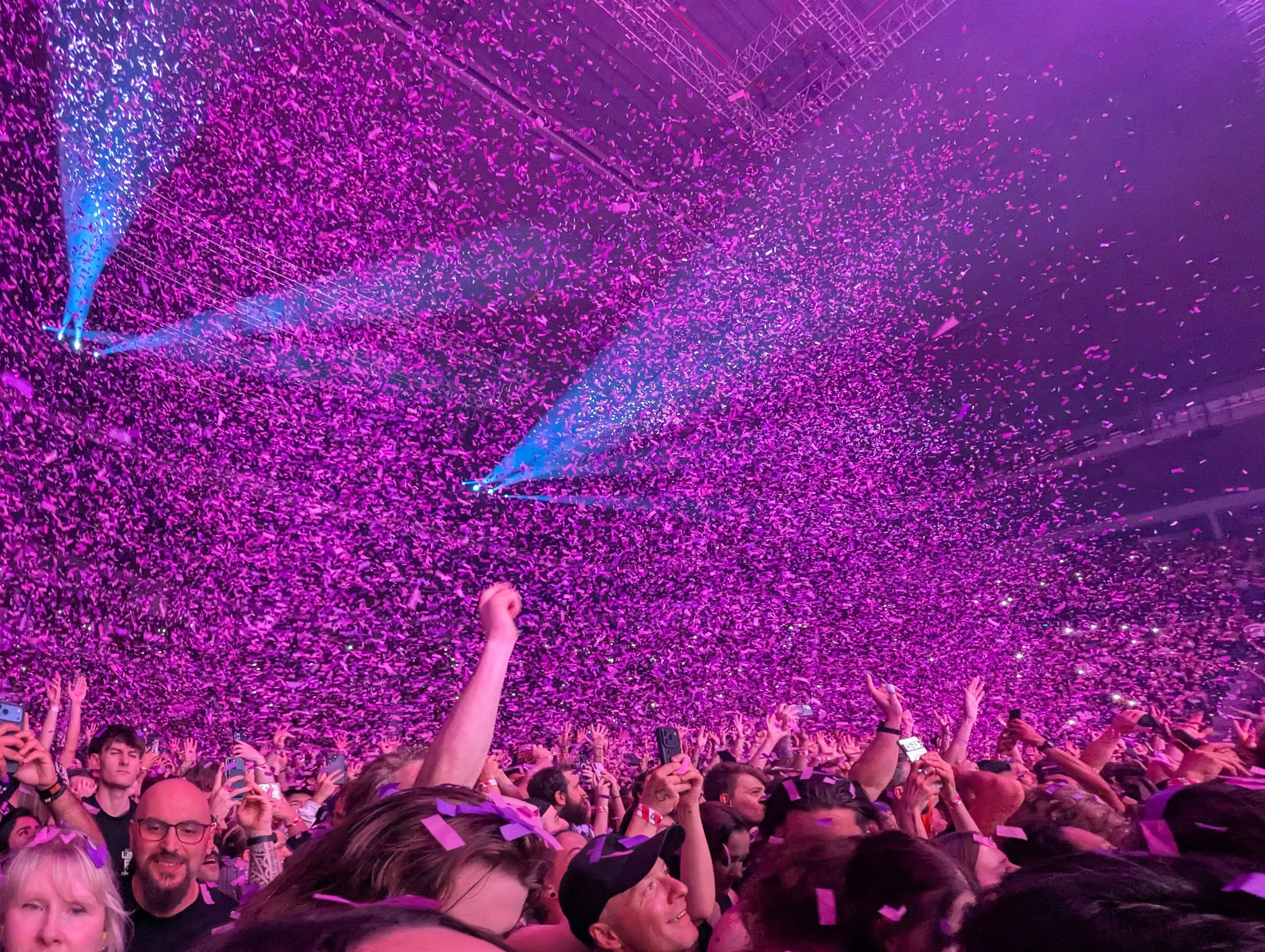 Photo of an arena showing a wall of pink and purple confetti that has been blown out of confetti canons arranged in front of a massive stage. The confetti is floating above the thousands of people standing on the arena floor.