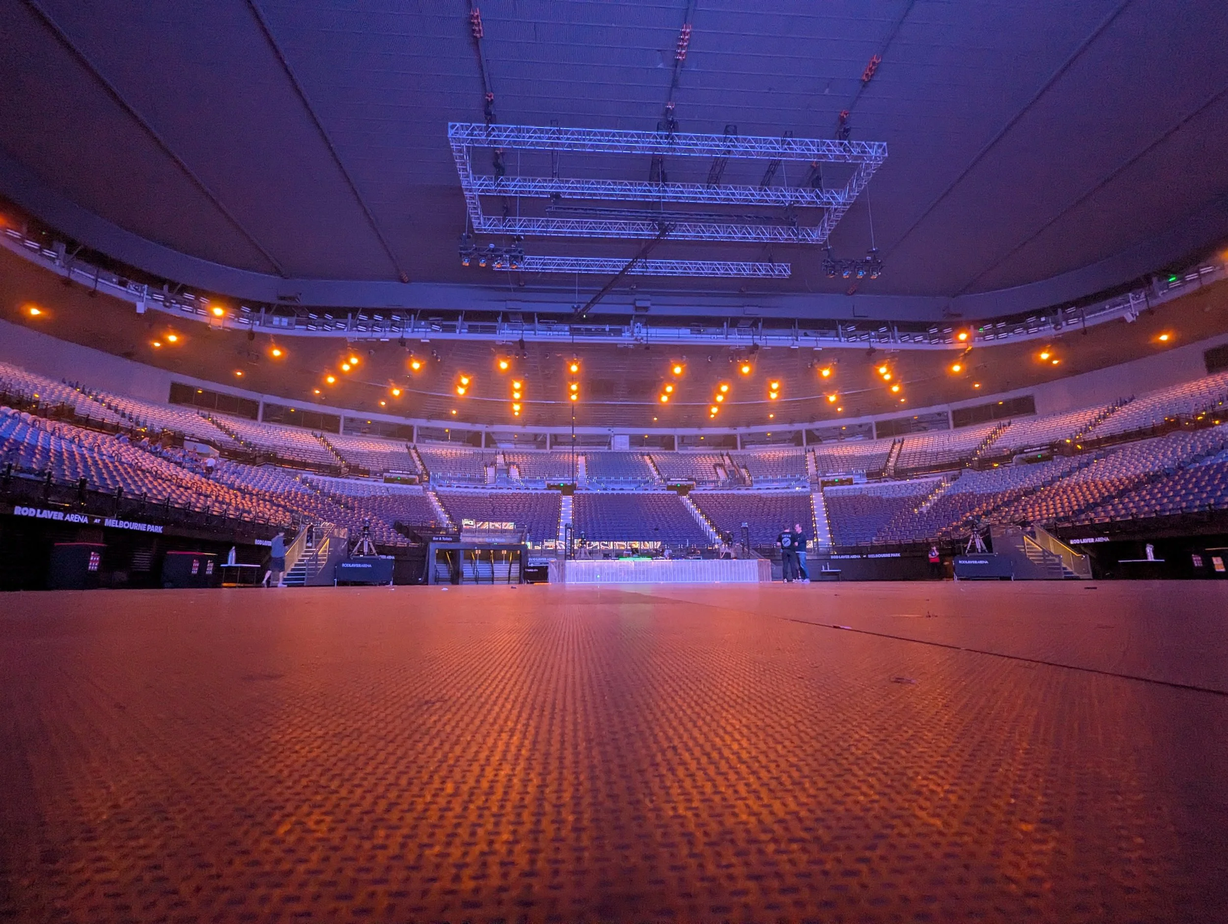 We were escorted into the empty Rod Laver Arena floor at 5:30pm, a full 45 minutes before gates opened to the general public at 6:15pm – which was super cool.