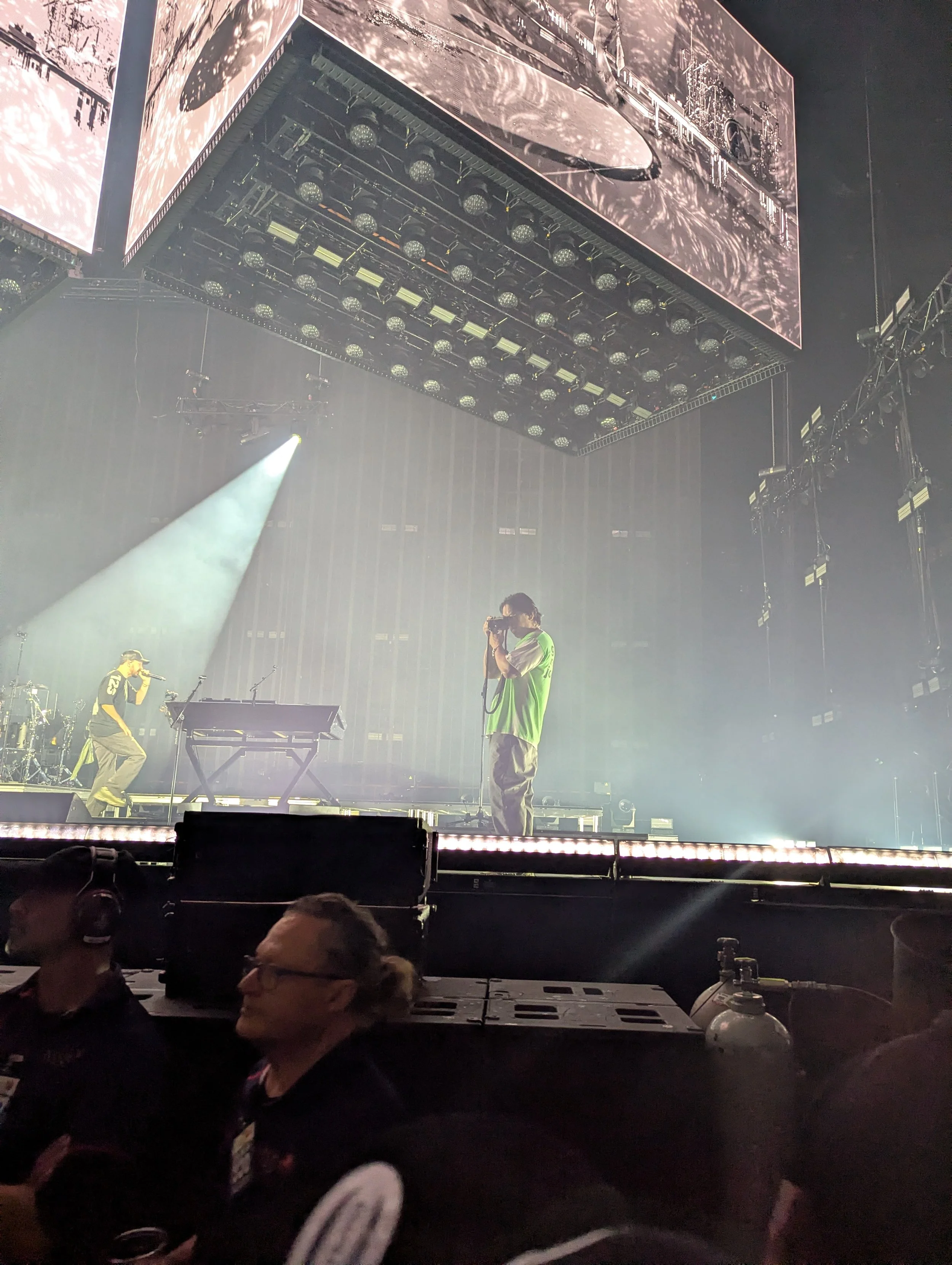 Photo of musician Joe Hahn taking photos of the crowd while his fellow band members perform on stage at a arena concert.