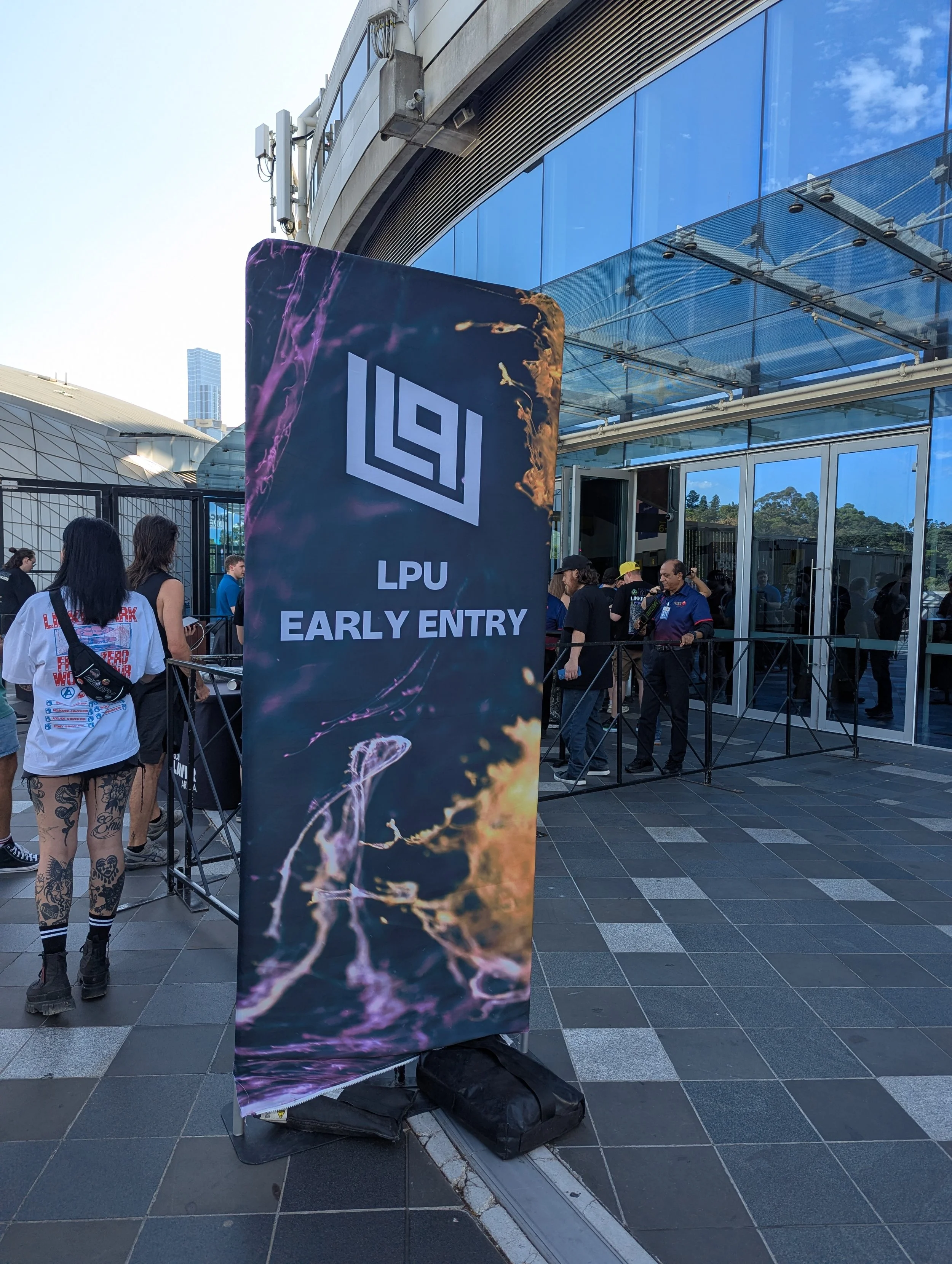 Photo of a pull-up banner outside of an arena that reads, “LPU early entry”.