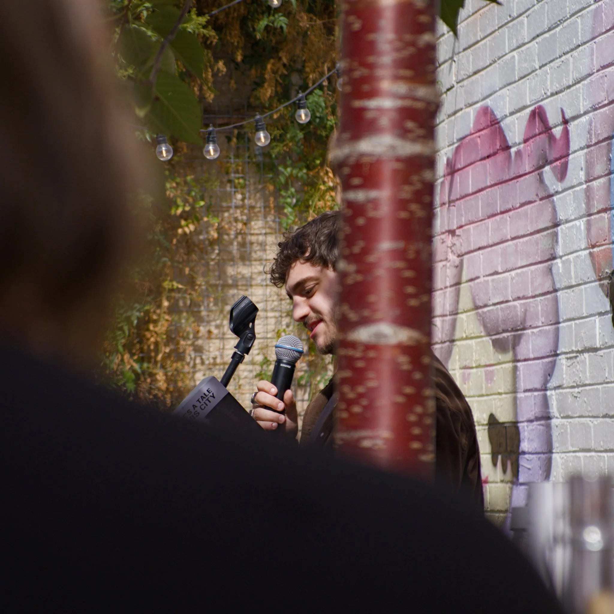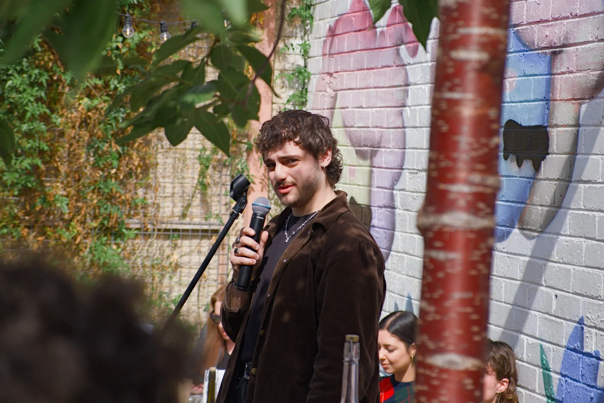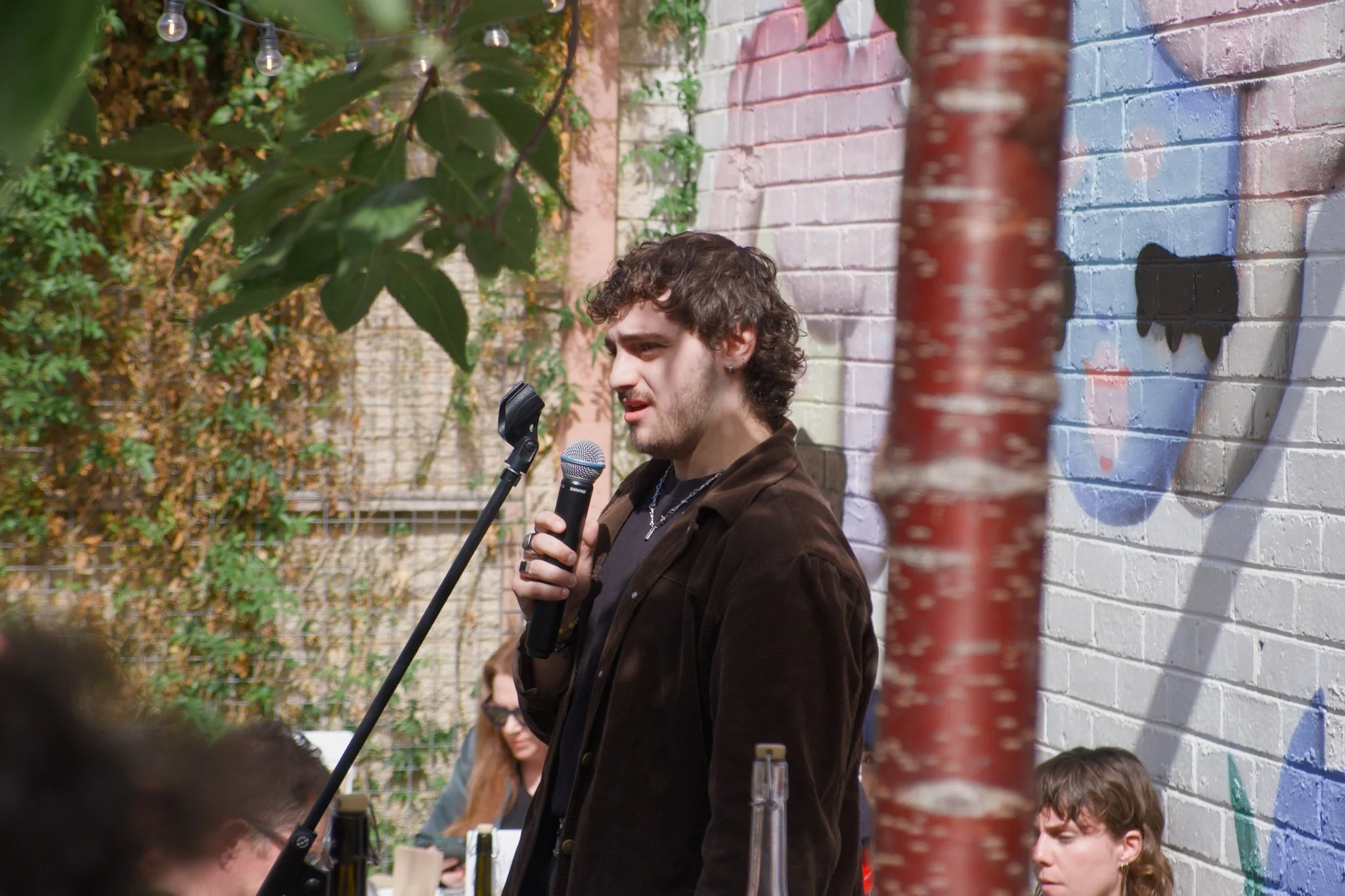 Photo of poet Jaidyn Attard standing in a wine-bar courtyard. He is reciting his poetry into a microphone that he is holding in his hand. Jaidyn is wearing a black t-shirt and brown overshirt. Jaidyn is also looking straight at the photographer taking this photo.
