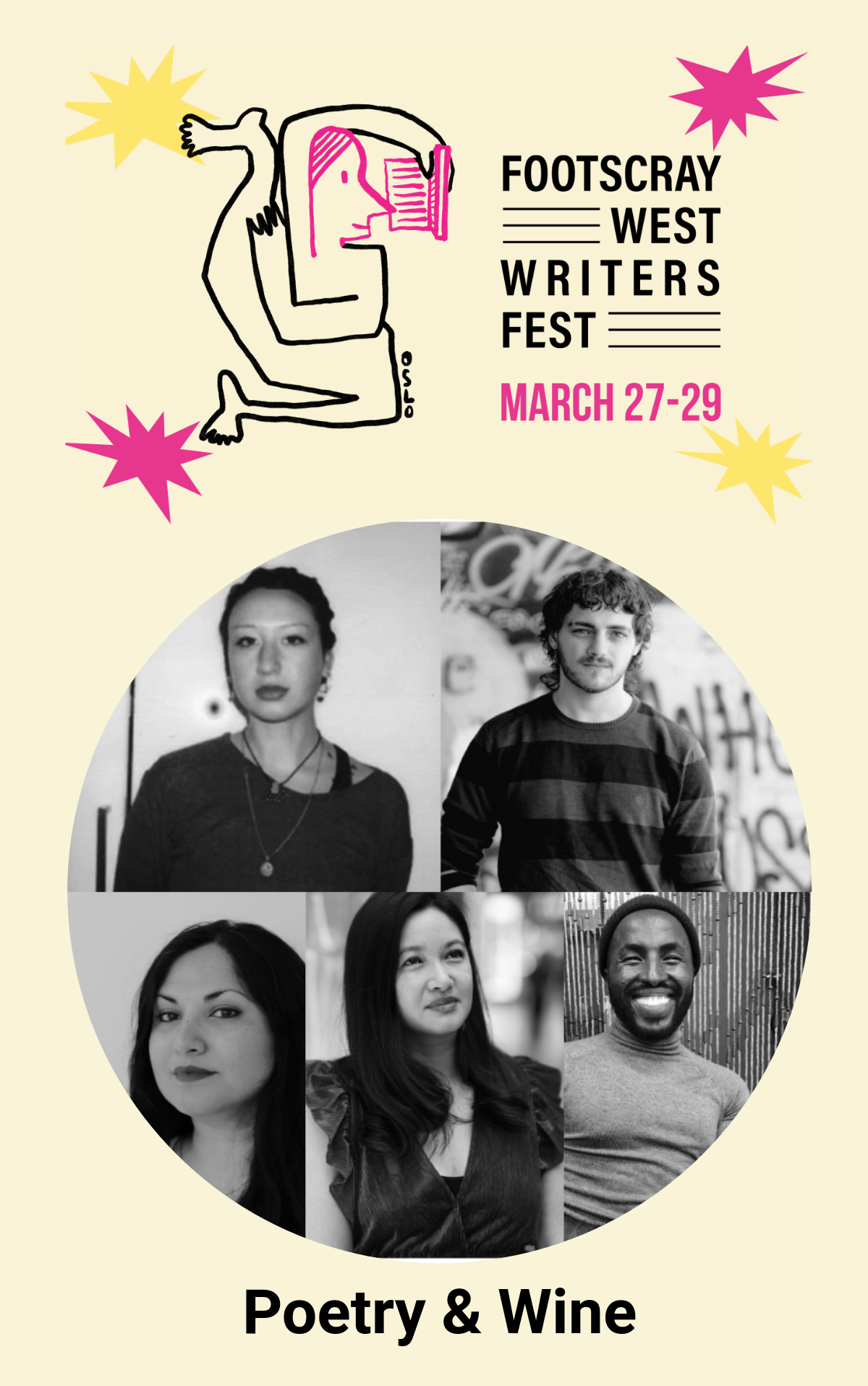 Graphic showing the Footscray West Writers Fest 2026 logo and a circular collage of black-and-white photos of the speakers at the ‘Poetry & Wine’ session.