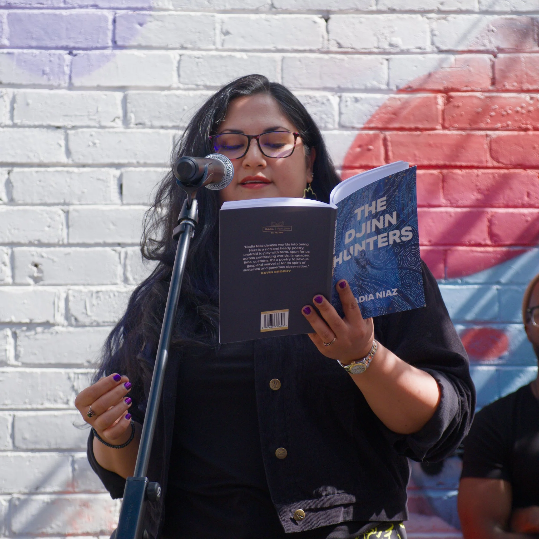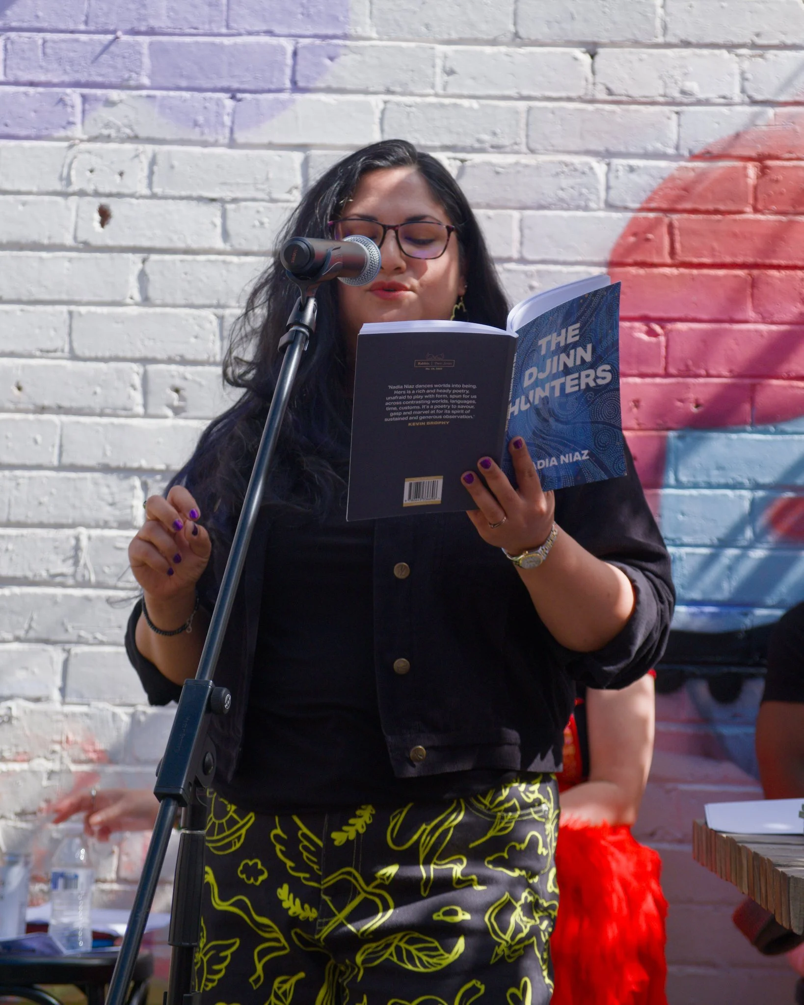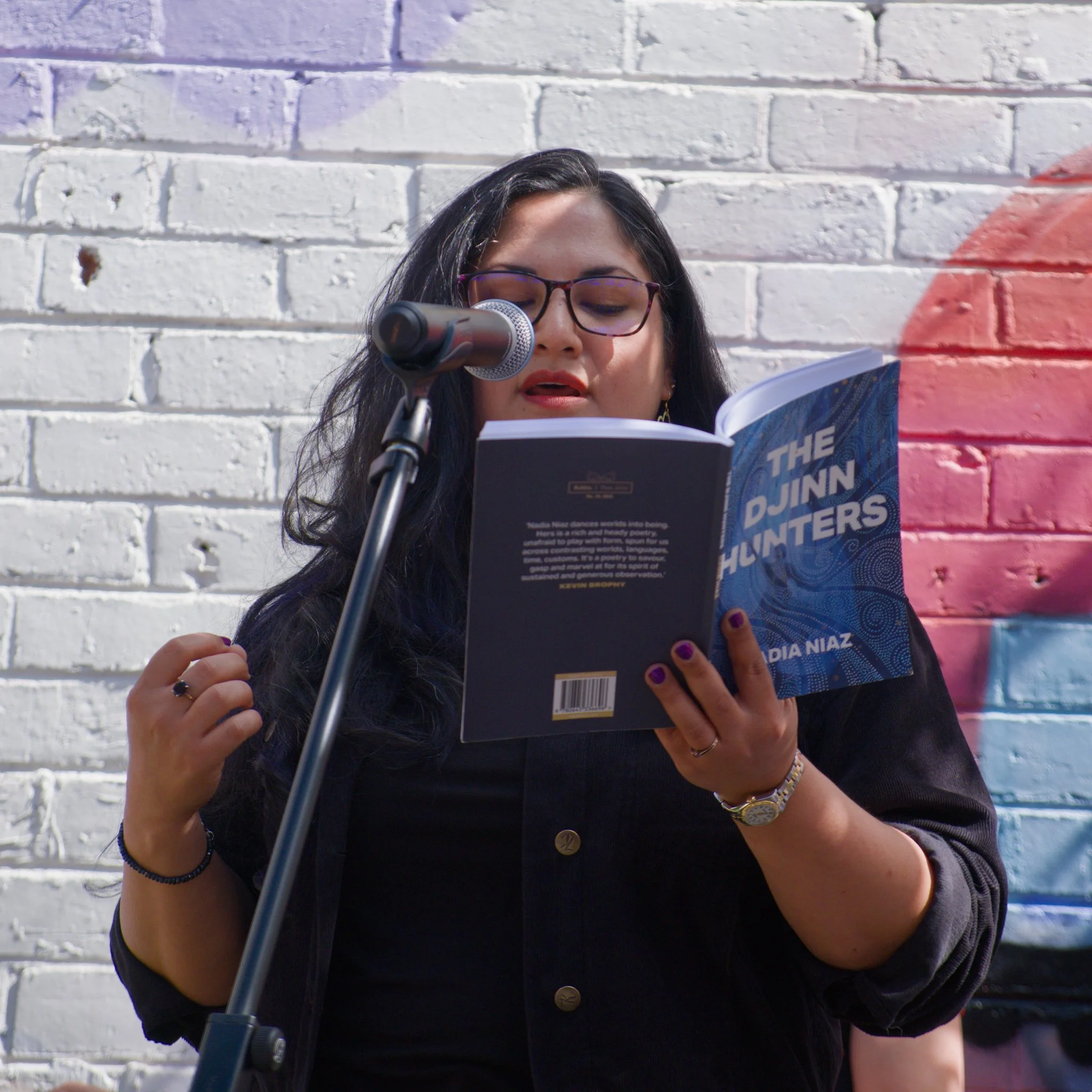 Photo of poet Nadia Niaz standing in a wine-bar courtyard. Nadia is reciting her poetry into the microphone that is on a mic-stand in front of her. She is gesturing with her right hand while holding open her book, The Djinn Hunters, in her left hand. Nadia is wearing a black top and black jacket.