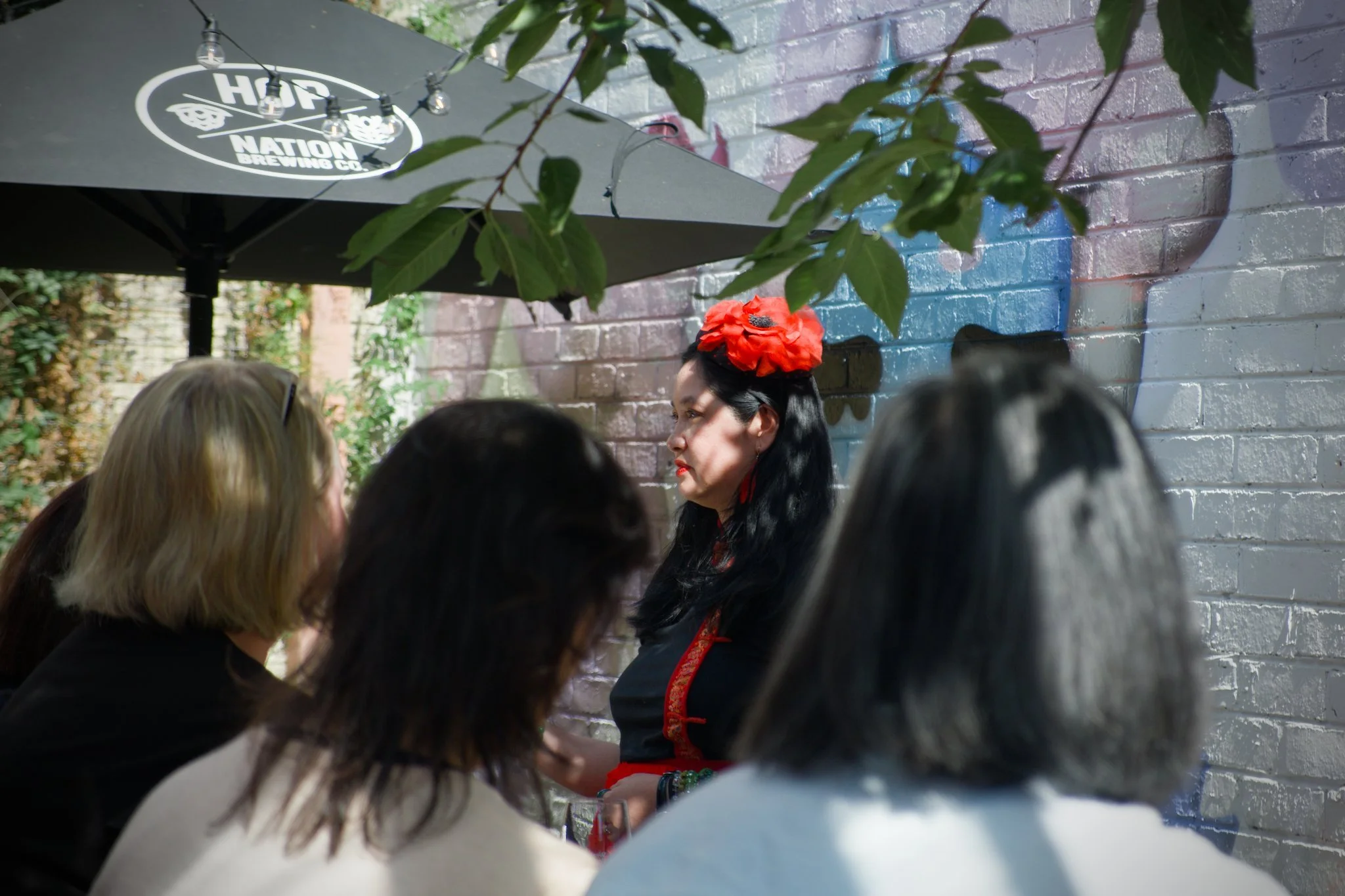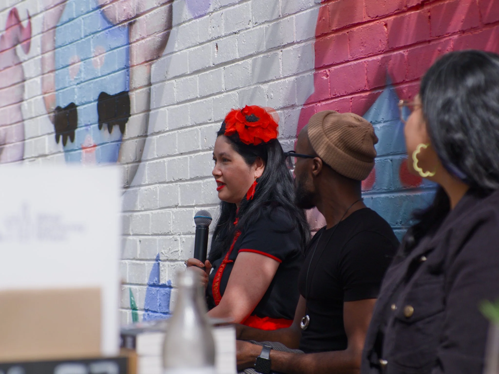 Photo of poet Thuy On seated in an outdoor courtyard. She is speaking into a microphone that she is holding in her hand. Thuy is wearing a red-and-black dress with a bright-red flower fascinator in her hair.