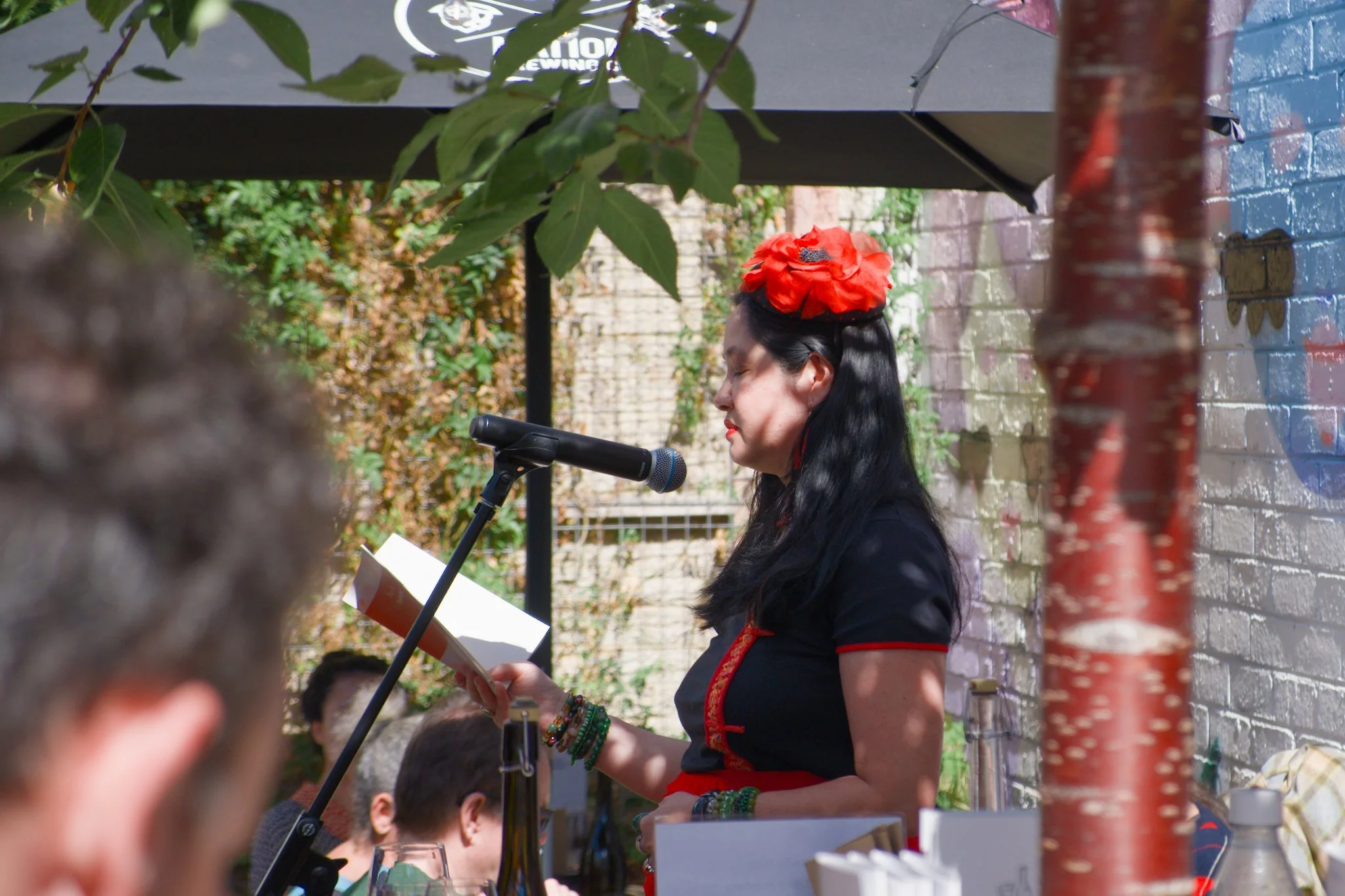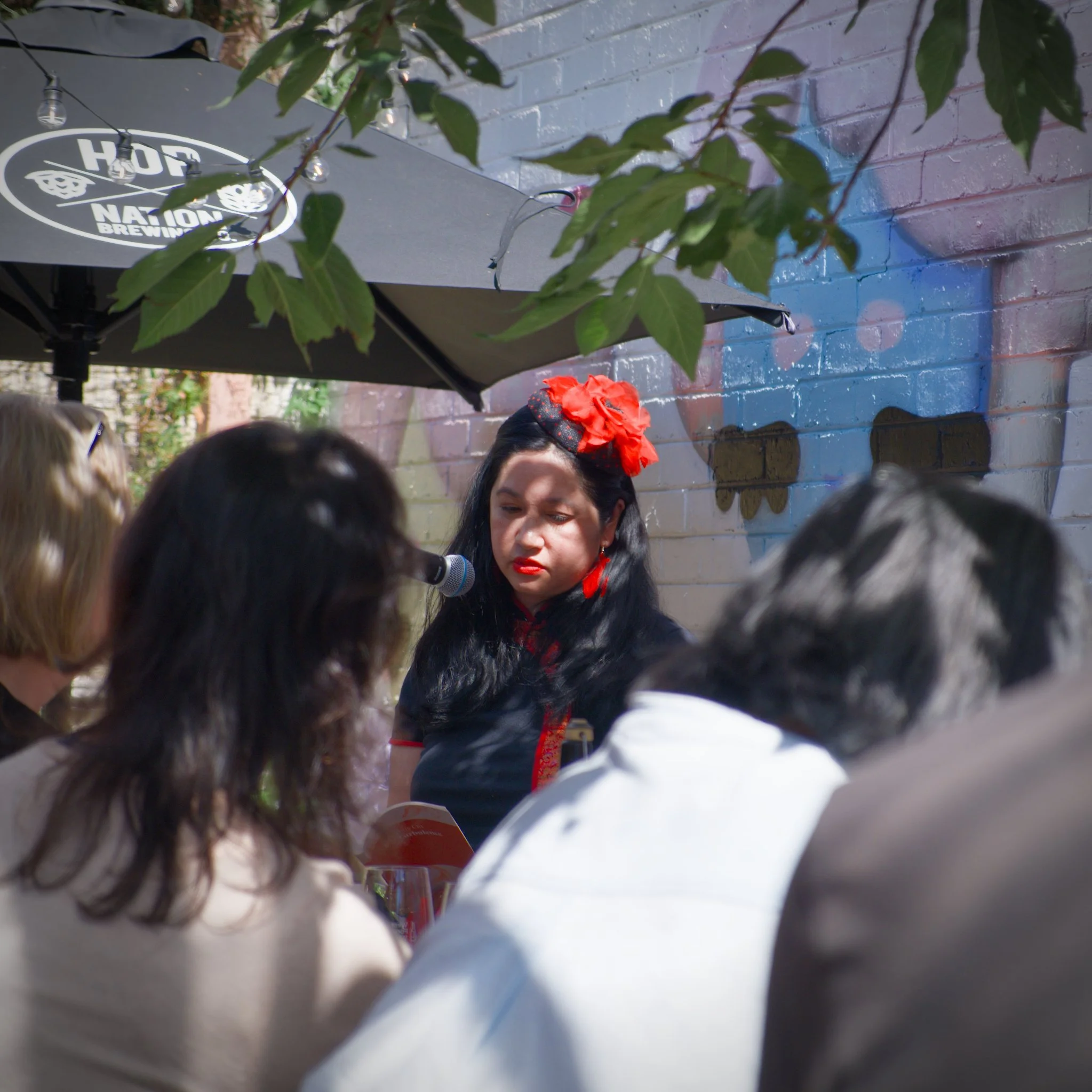 Photo of poet Thuy On standing in a wine-bar courtyard. Thuy is reciting her poetry into the microphone that is on a mic-stand in front of her. She is holding open one of her poetry books with her right hand. Thuy is wearing a red-and-black dress with a bright-red flower fascinator in her hair.
