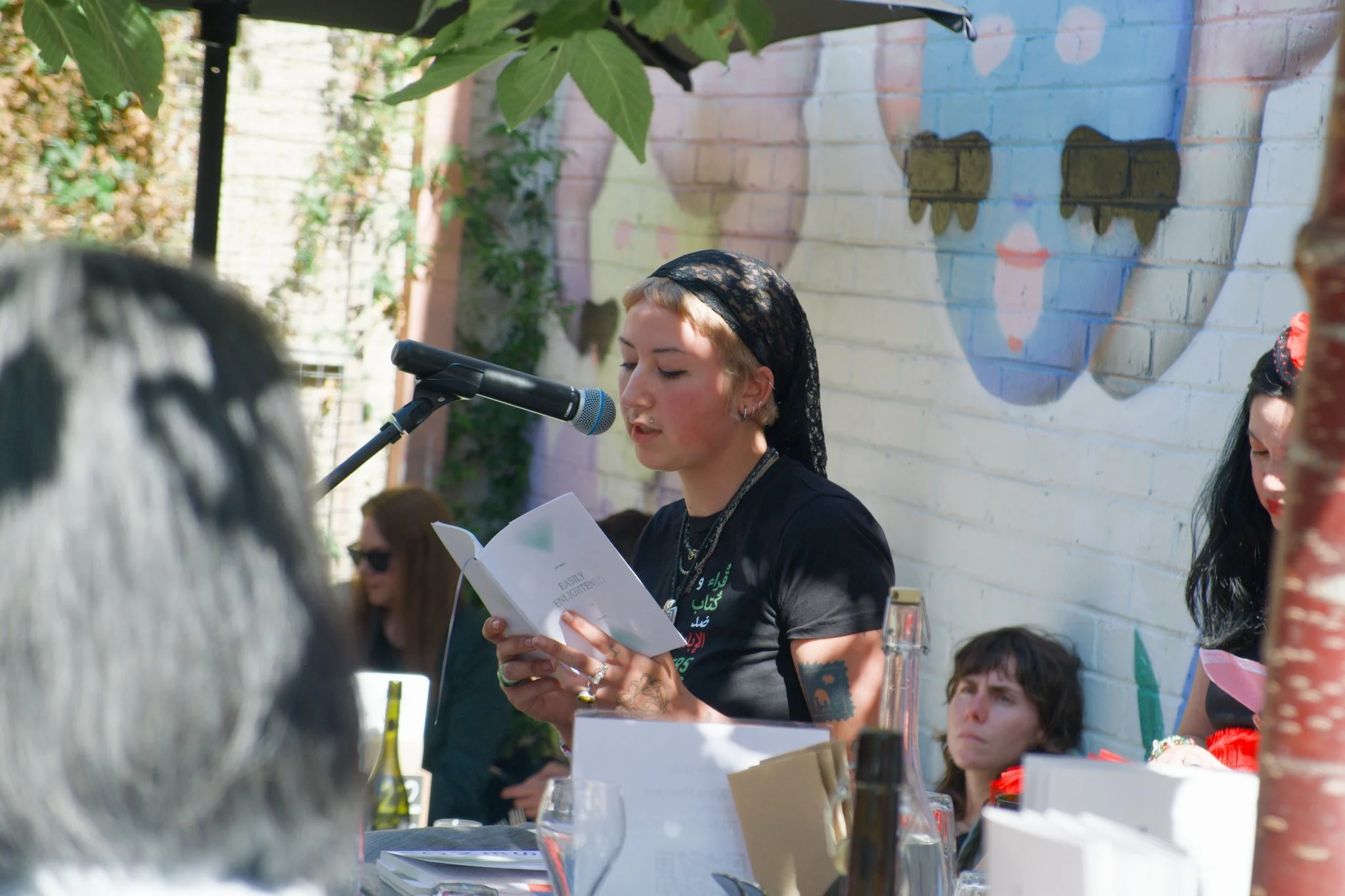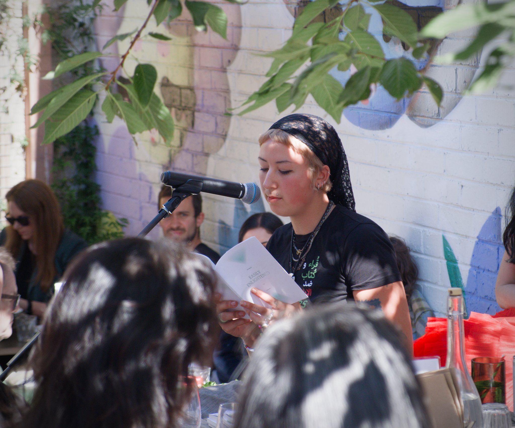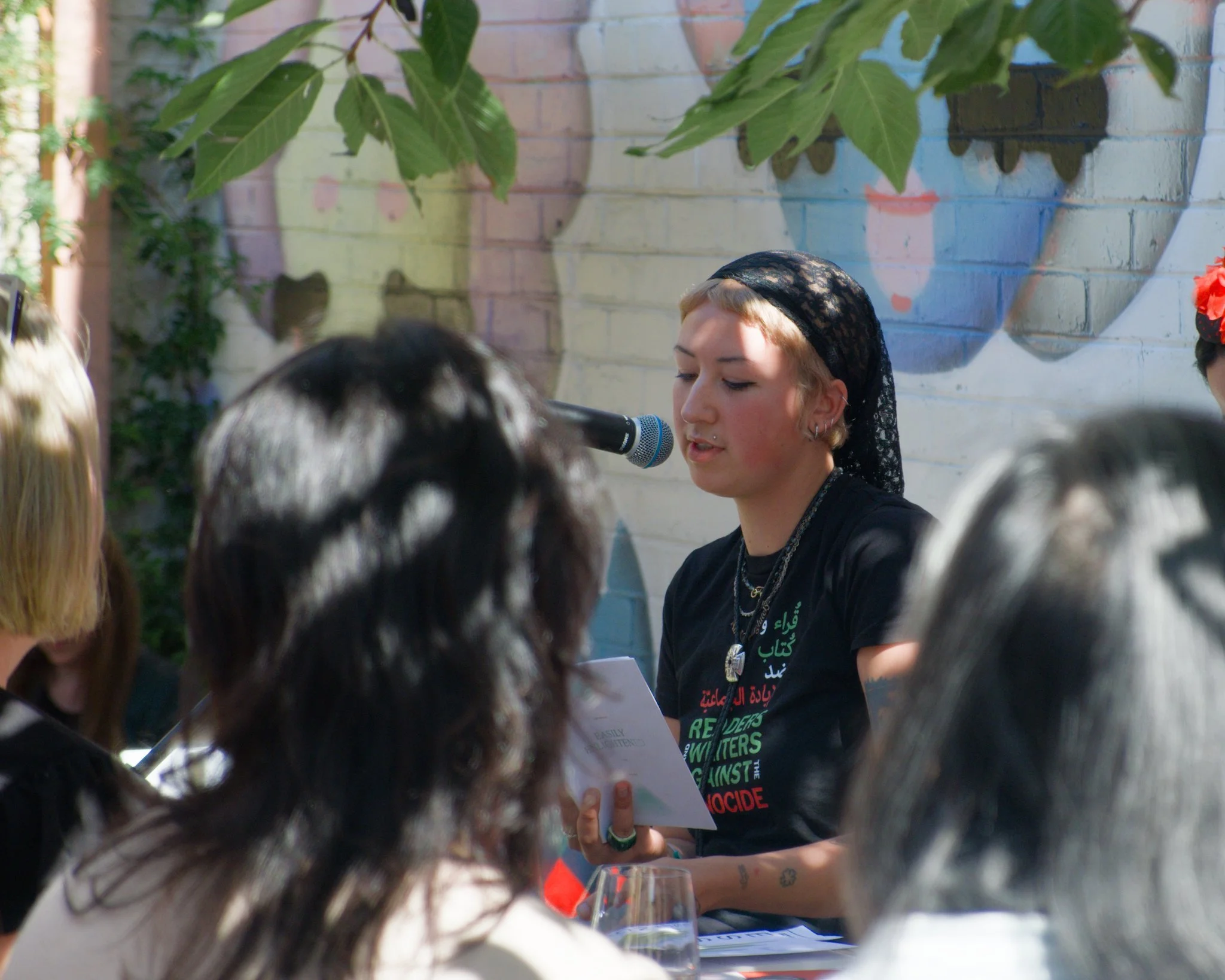 Photo of poet Lili Ward seated in a wine-bar courtyard. Lili is reciting her poetry into the microphone that is on a mic-stand in front of her. She is reading from her poetry book, Easily Enlightened. Lili is wearing a black t-shirt that reads, "Readers and writers against the genocide".