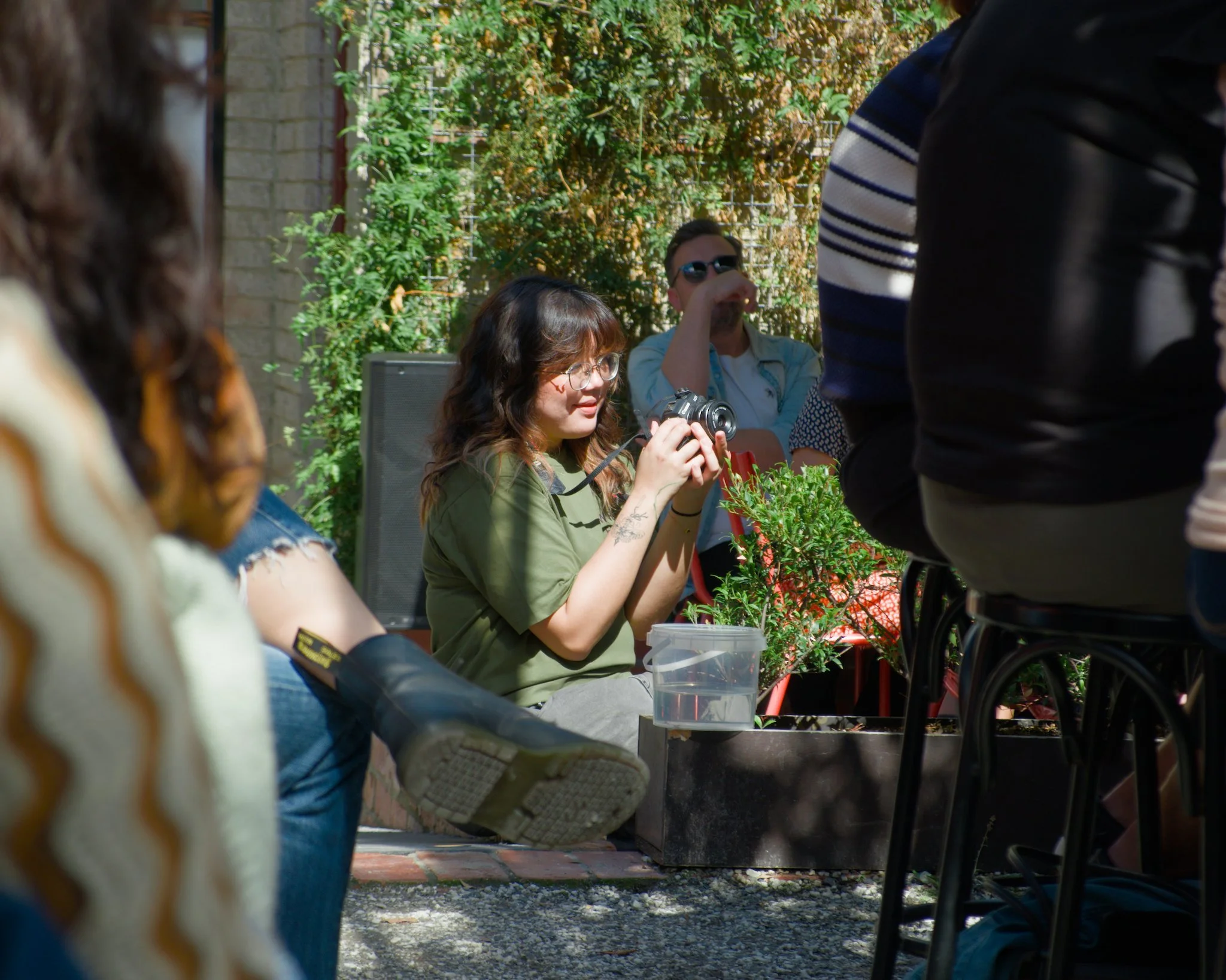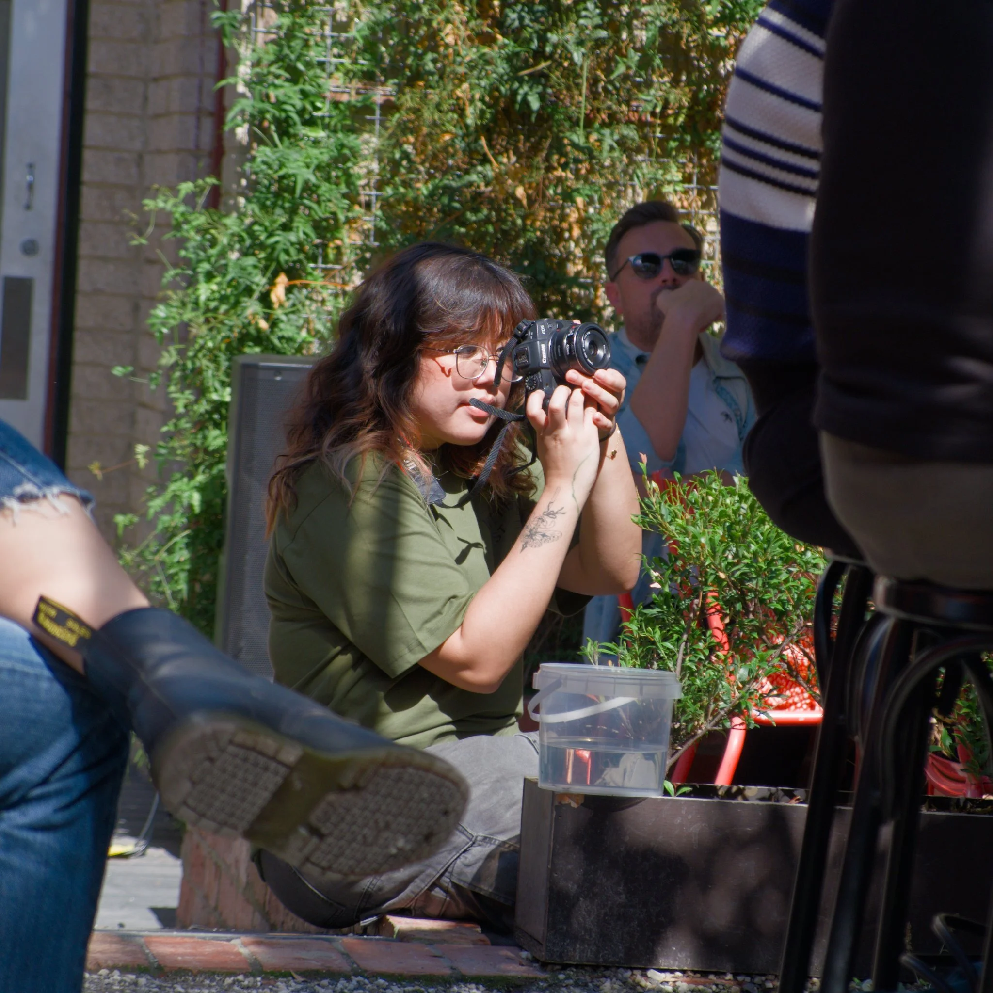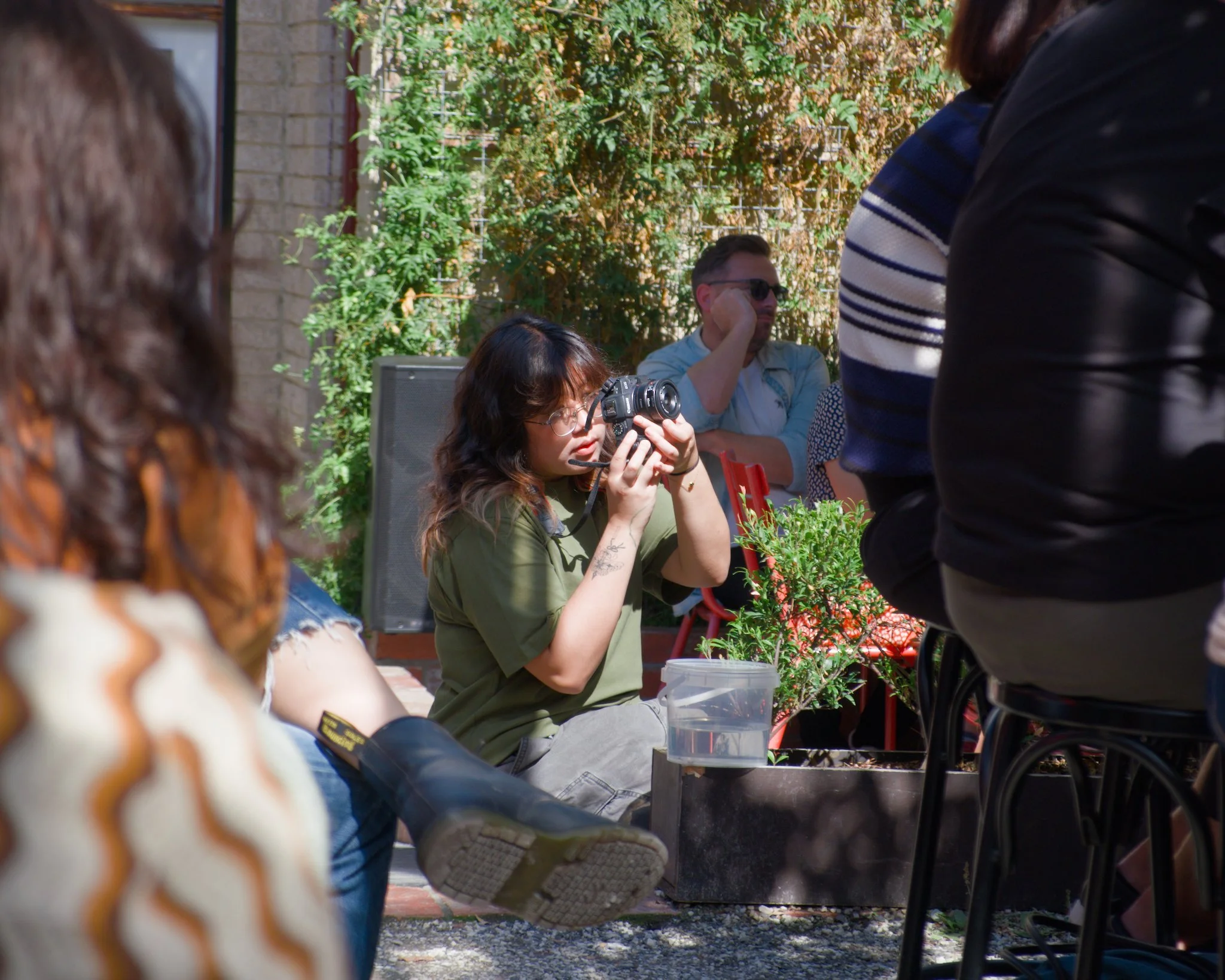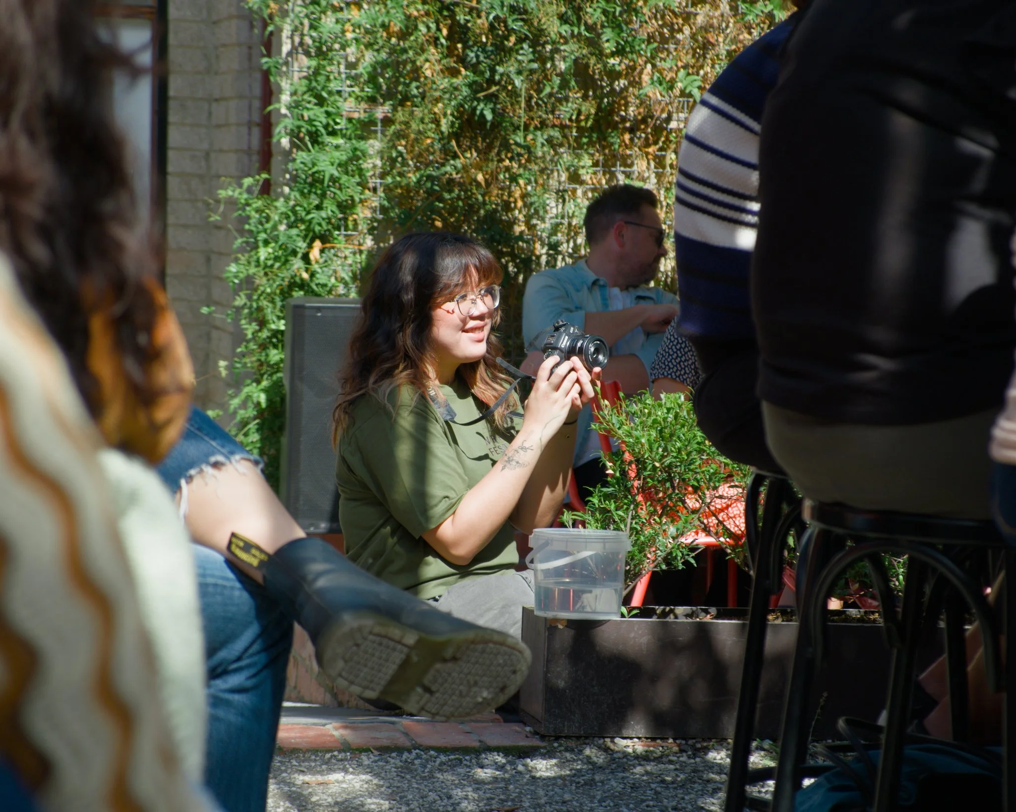 Photo of a young woman wearing grey jeans and an olive green event-branded t-shirt who is sitting on a walkway that connects at wine-bar courtyard to the main building. This photo is taken between rows of audience members seated at an outdoor poetry reading event. The woman is using a Canon DSLR camera to take a photo of the speaker who is currently reciting their poetry.