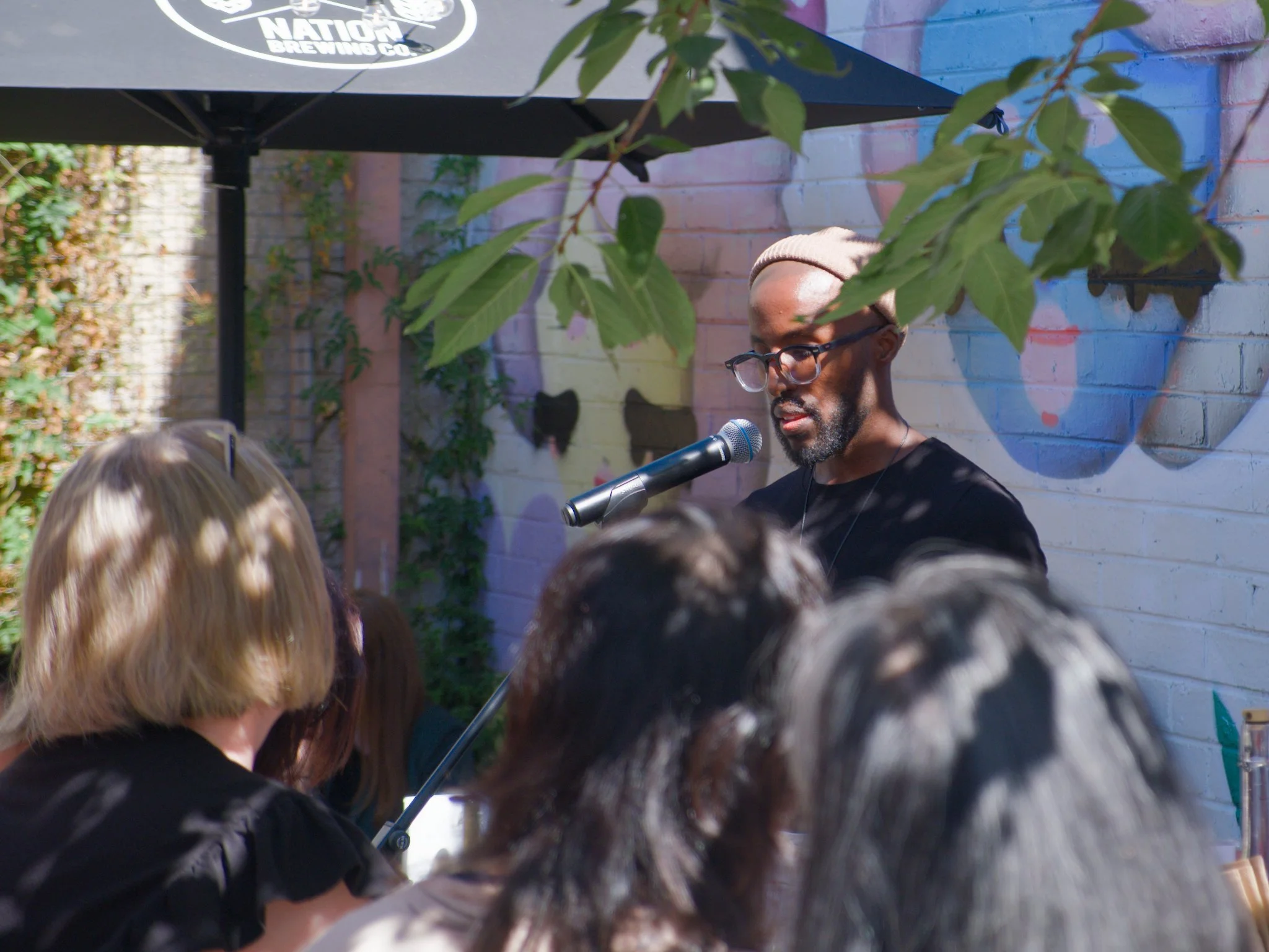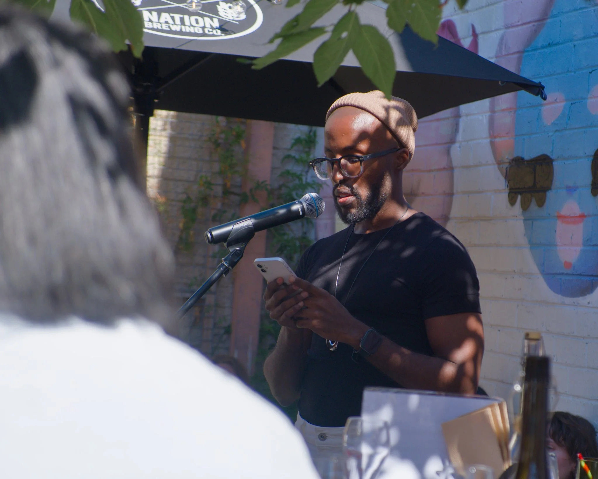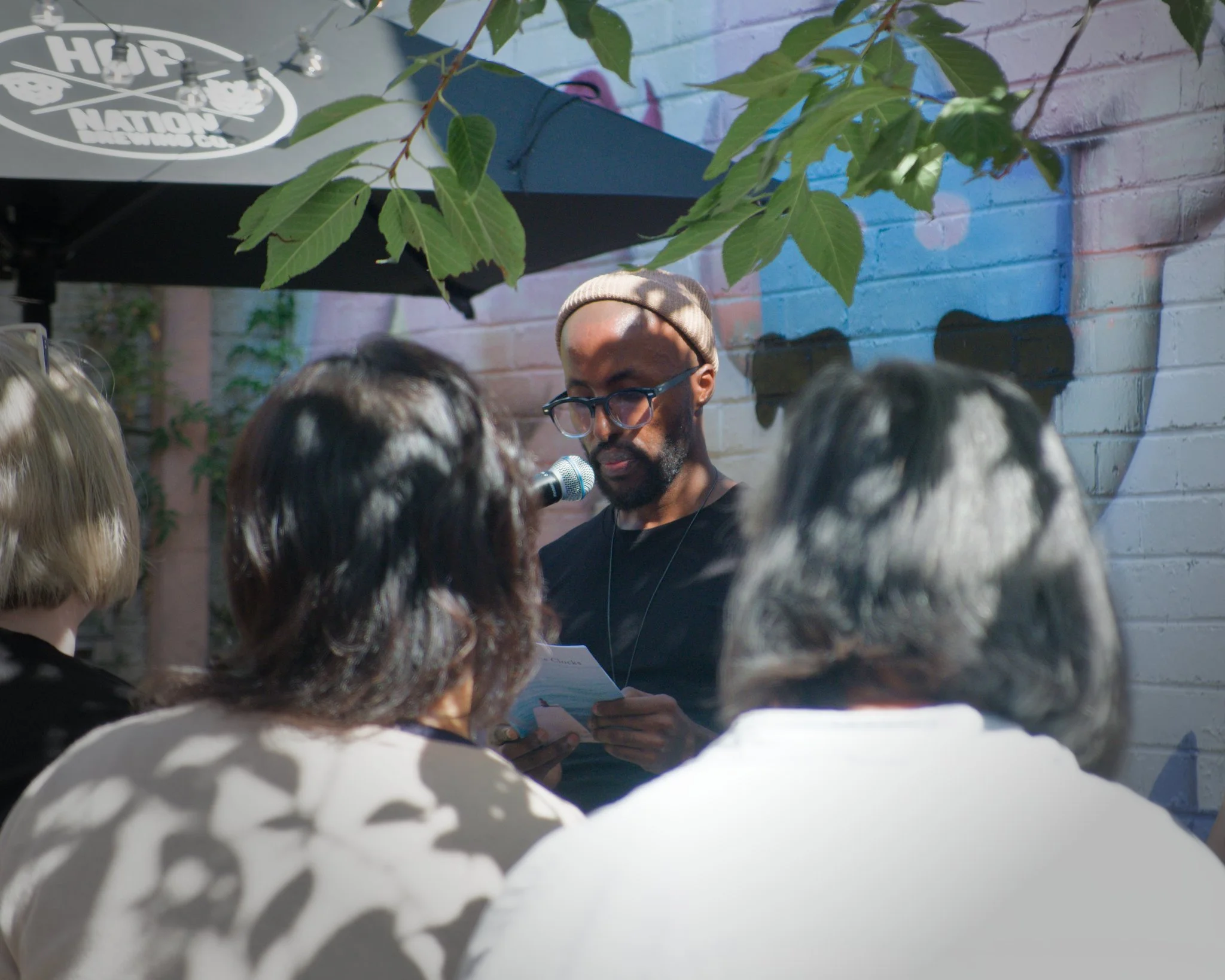 Photo of poet Magan Magan standing in a wine-bar courtyard, as seen above the heads of some audience members. Magan is reciting his poetry into the microphone that is on a mic-stand in front of him. Magain is wearing a black t-shirt and brown wool cap, and he is reading from the smartphone he is holding in his hands.