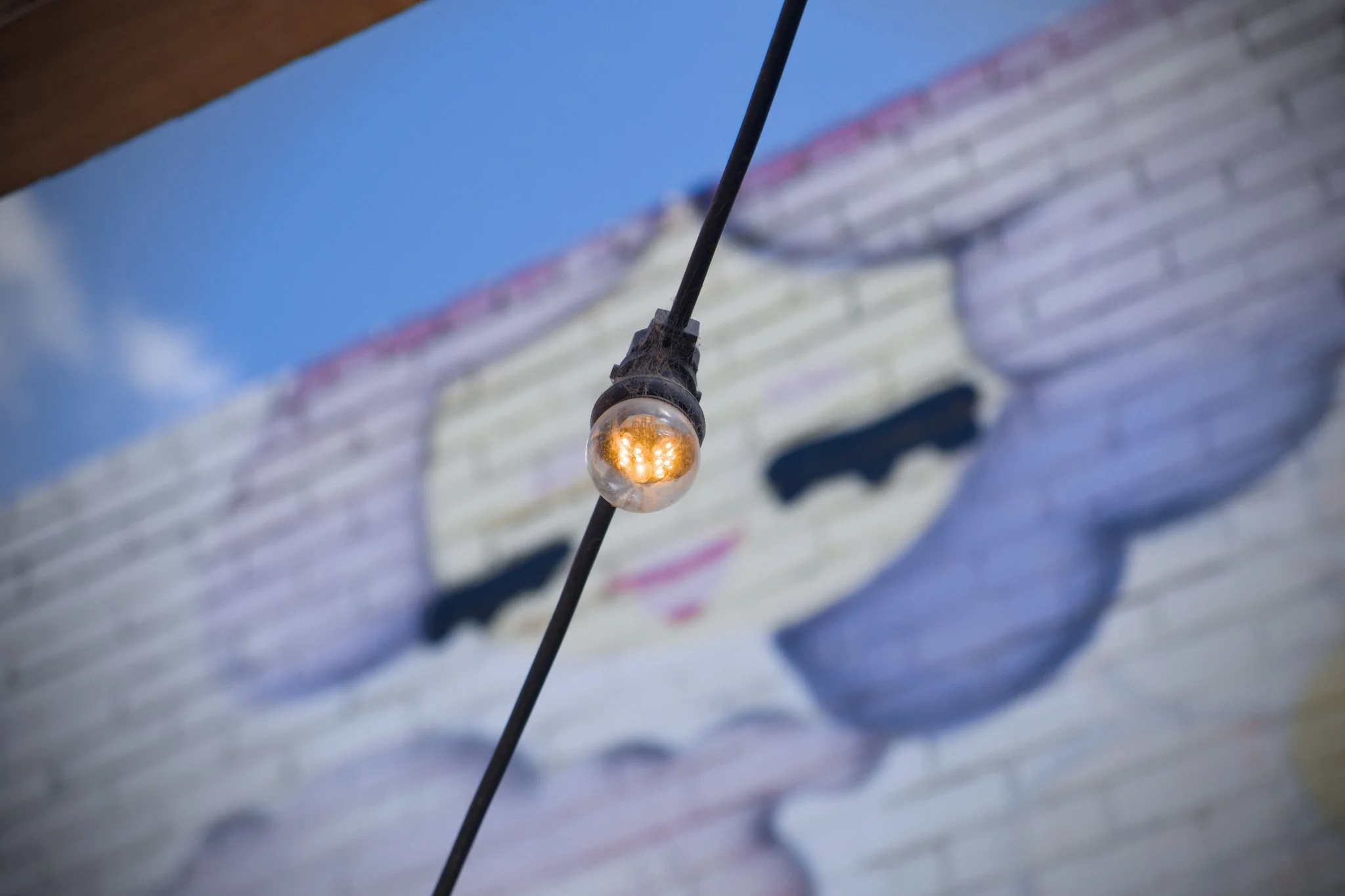 Photo of an LED light globe affixed to a string of outdoor lights in a wine-bar courtyard. There are cobwebs on the light fixture and, in the background of the photo, you can see an out-of-focus mural painted on the courtyard wall.