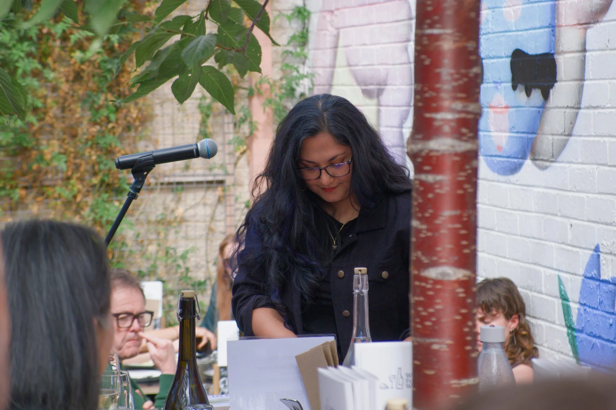 Photo of poet Nadia Niaz standing at a table in a wine-bar courtyard. Nadia is sorting through some papers on the table as she prepares to read her poetry to the audience.