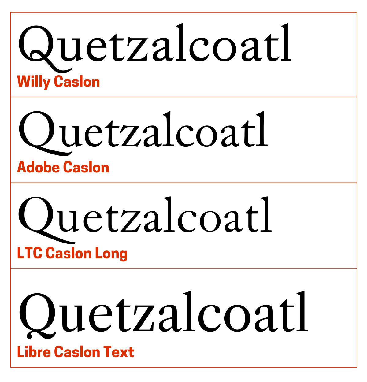 Graphic showing the word, “Quetzalcoatl” in large text set in four different typefaces: Willy Caslon, Adobe Caslon, LTC Caslon Long, Libre Caslon Text.