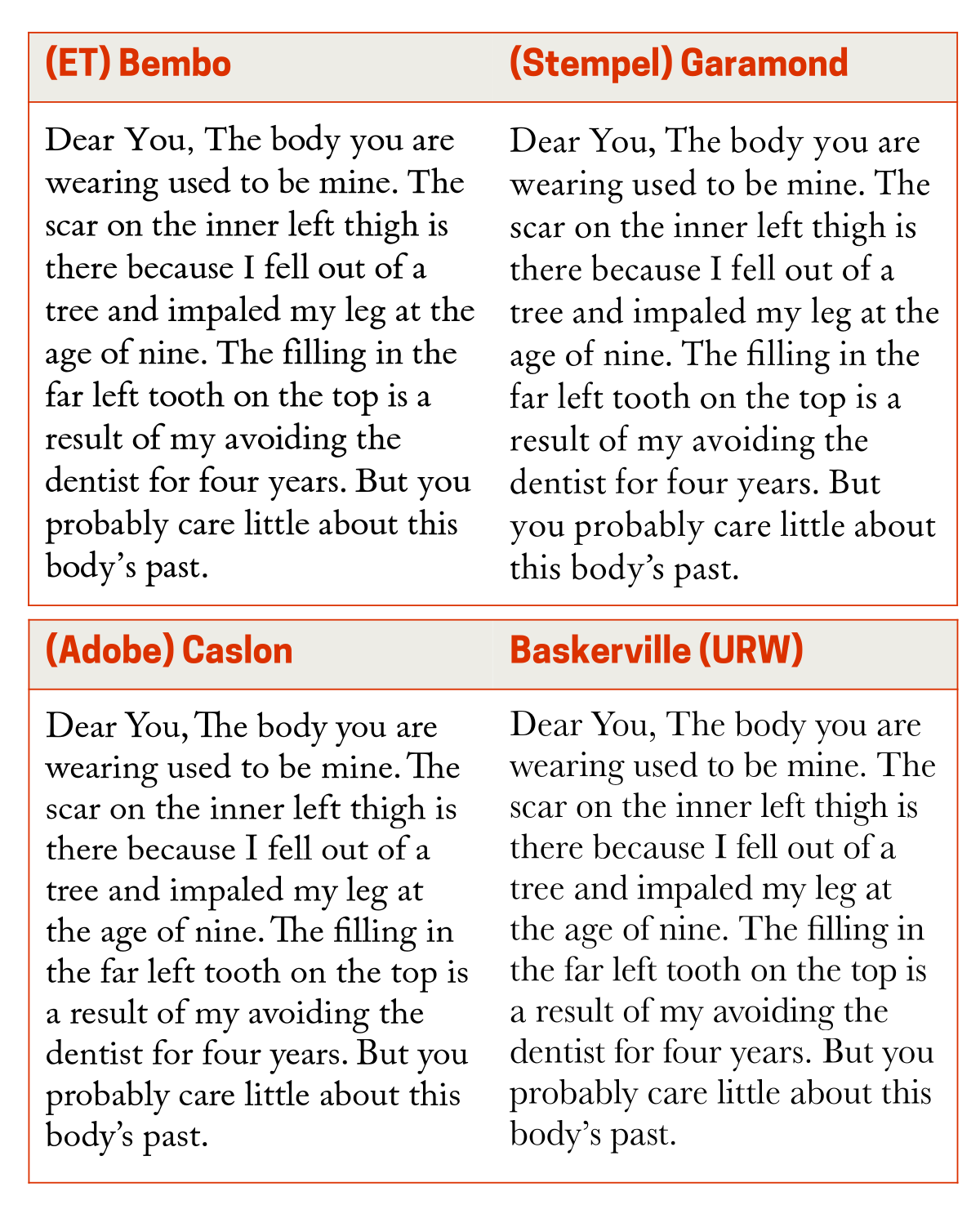 Graphic showing the opening paragraph from The Rook by Daniel O’Malley set in four different typefaces: ET Bembo, Stempel Garamond, Adobe Caslon, and Baskerville URW.