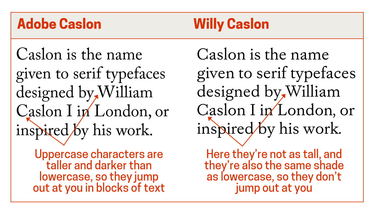 Graphic showing a paragraph of text set in both Adobe Caslon and Willy Caslon. Call-outs point to two capital letters in each paragraph. The call-out for Adobe Caslon reads, “Uppercase characters are taller and darker than lowercase, so they jump out at you in blocks of text”. The call-out for Willy Caslon reads, “Here they’re not as tall, and they’re also the same shade as lowercase, so they don’t jump out at you”.