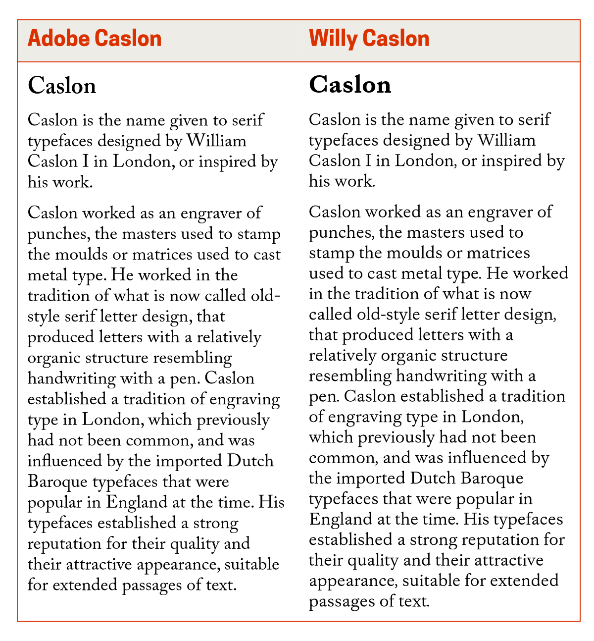 Graphic showing the first two paragraphs of the Wikipedia entry for Caslon set in two different typefaces, Adobe Caslon and Willy Caslon.