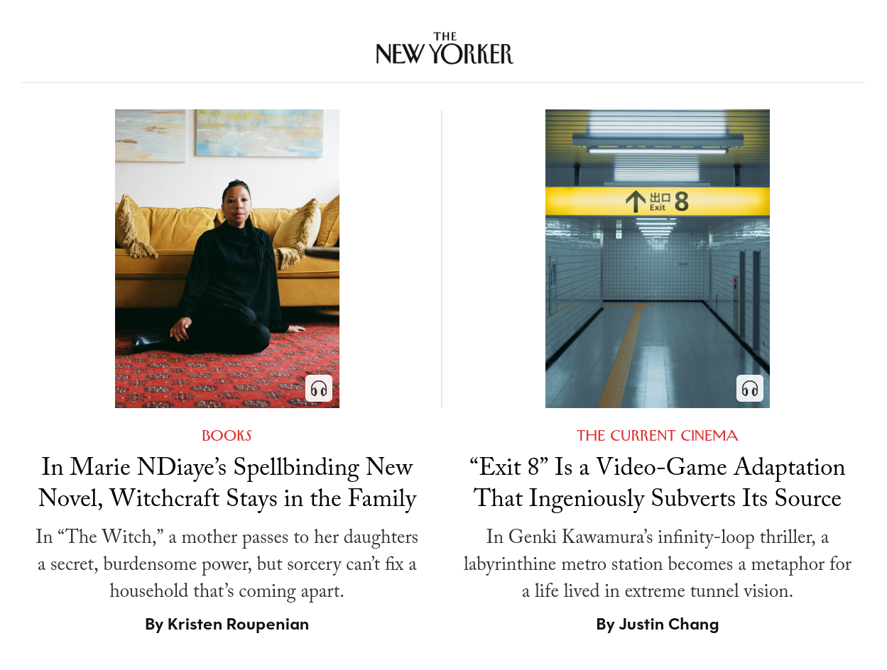 Screenshot from The New Yorker website showing two articles with the headings and text set in Adobe Caslon.