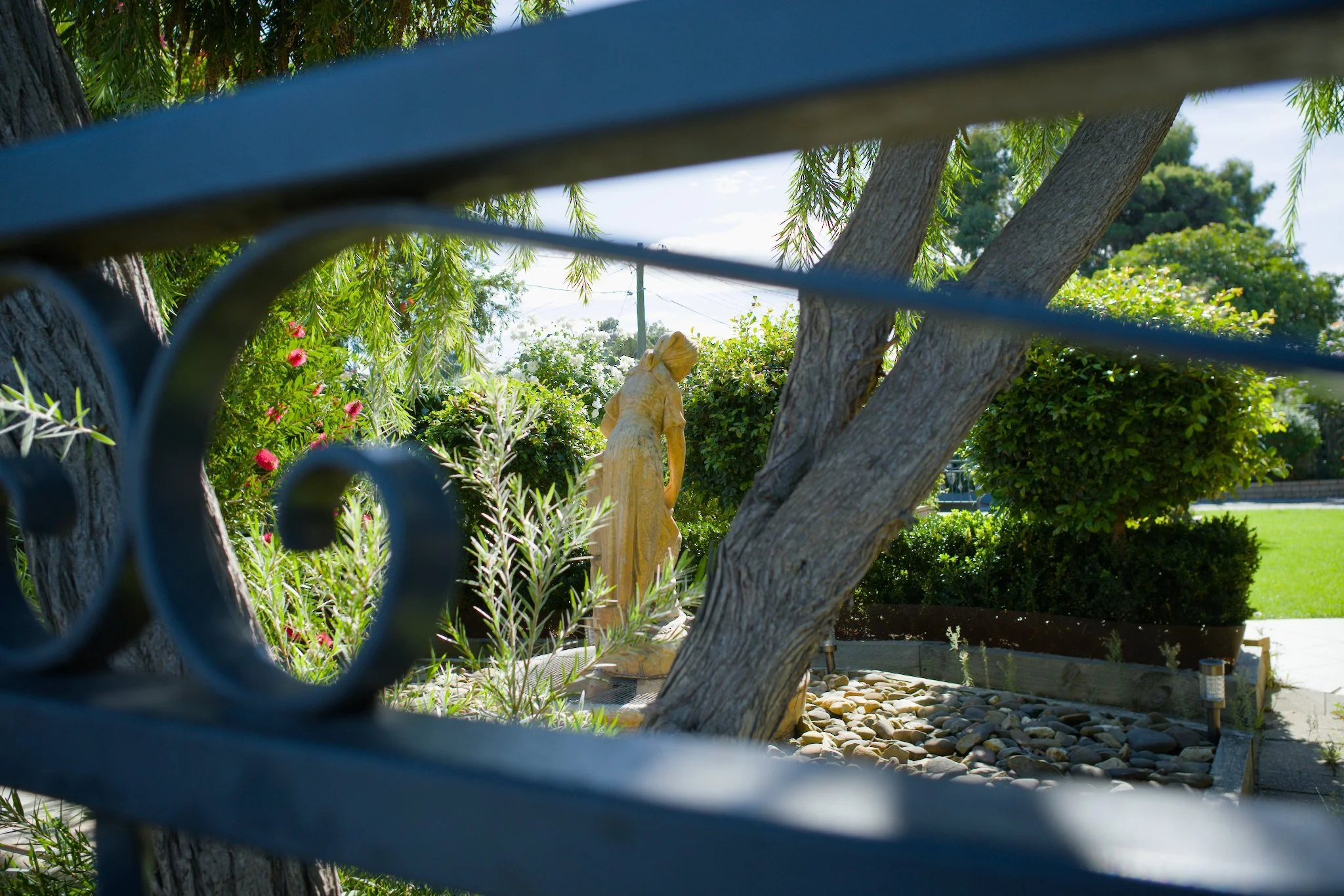 Photo taken through a wrought iron gate of a statue in a residential garden. The statue is of a woman in traditional European dress carrying a water jug.