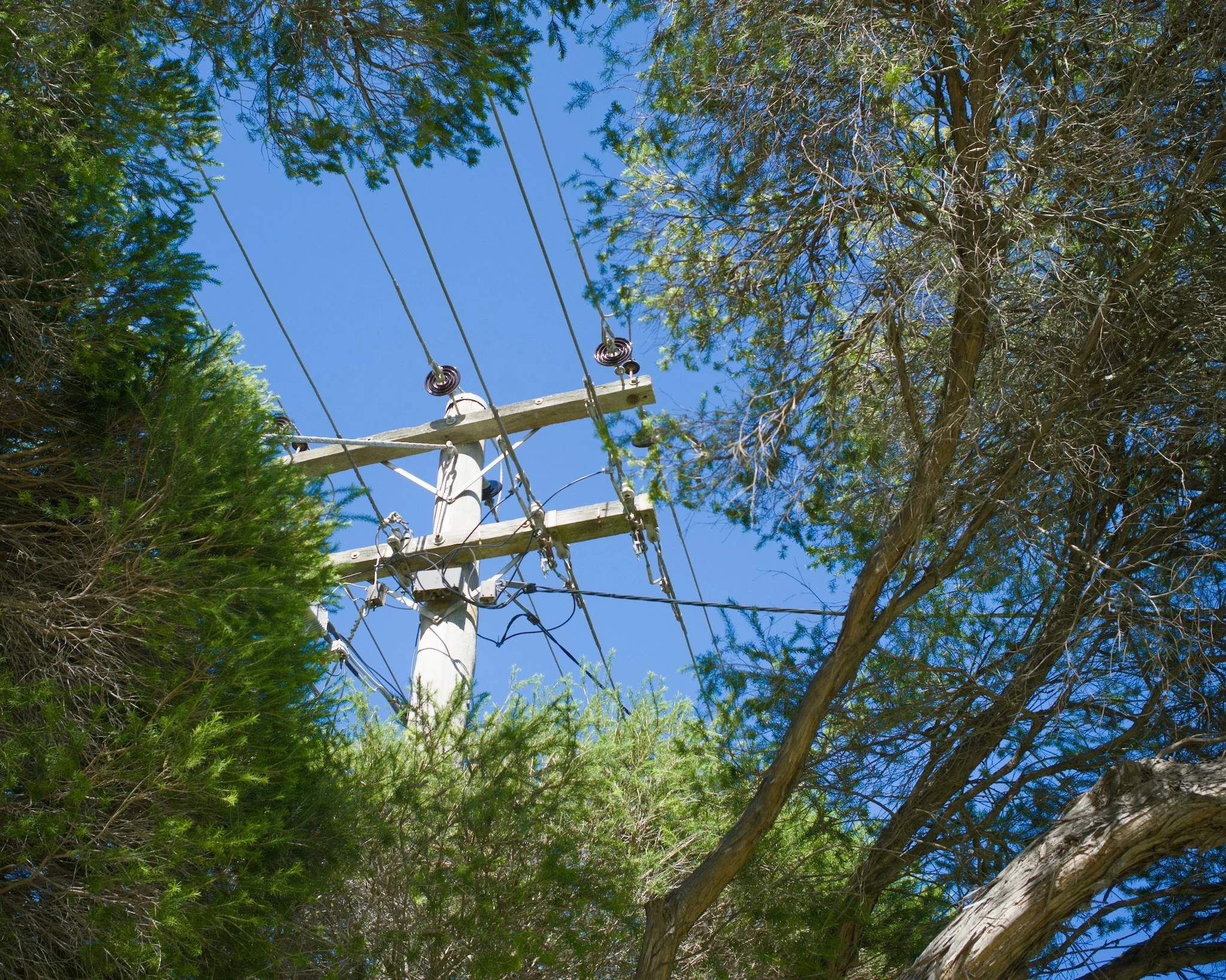 Photo looking up through a gap in a tree to a wooden electricity pole holding up multiple wires.