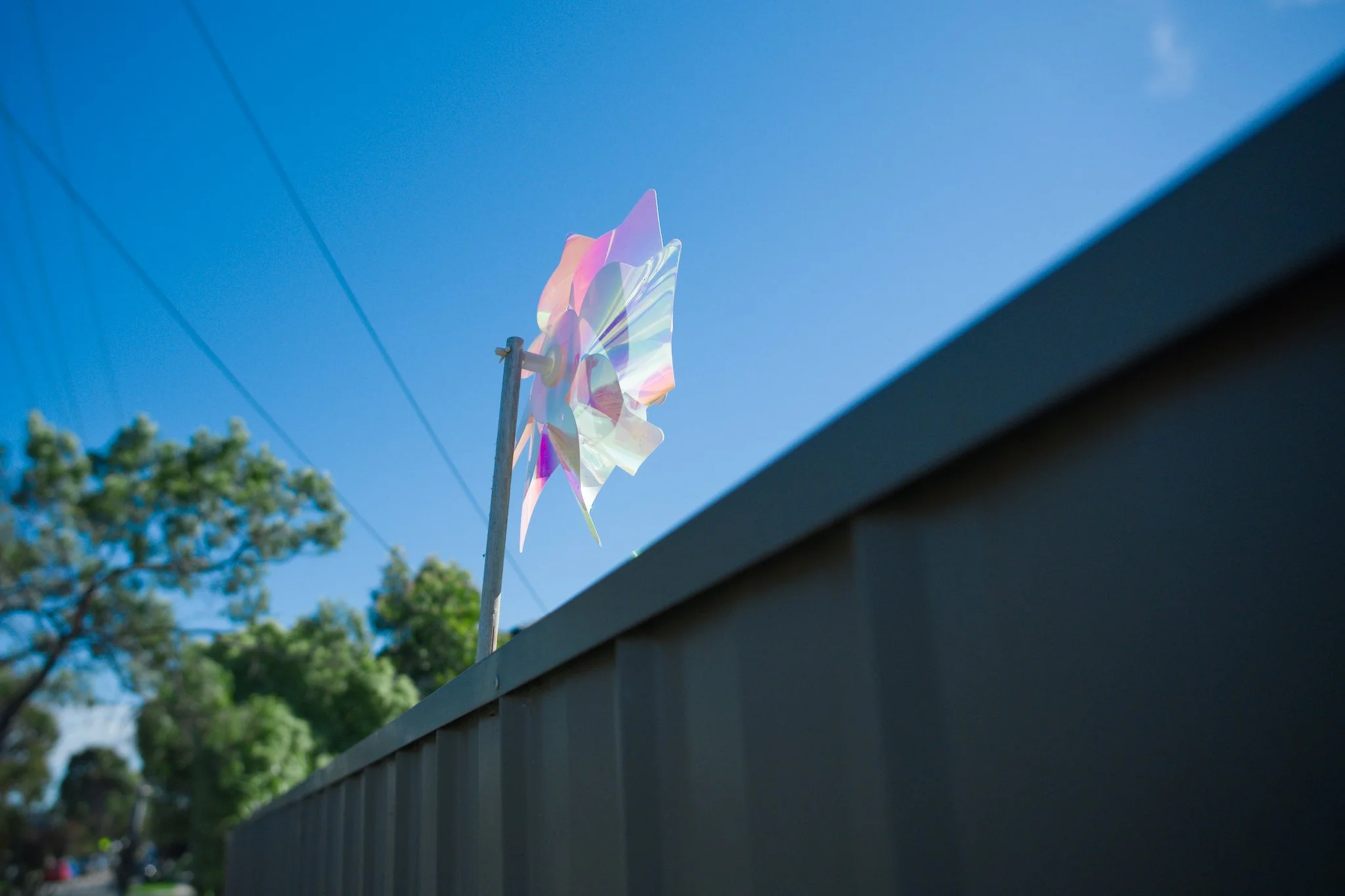 Photo of a colourful, decorative windmill affixed to a residential fence with a sturdy wooden stick. The windmill has wide, rounded sails made out of multi-coloured, translucent plastic in shades of blue, pink, and purple.