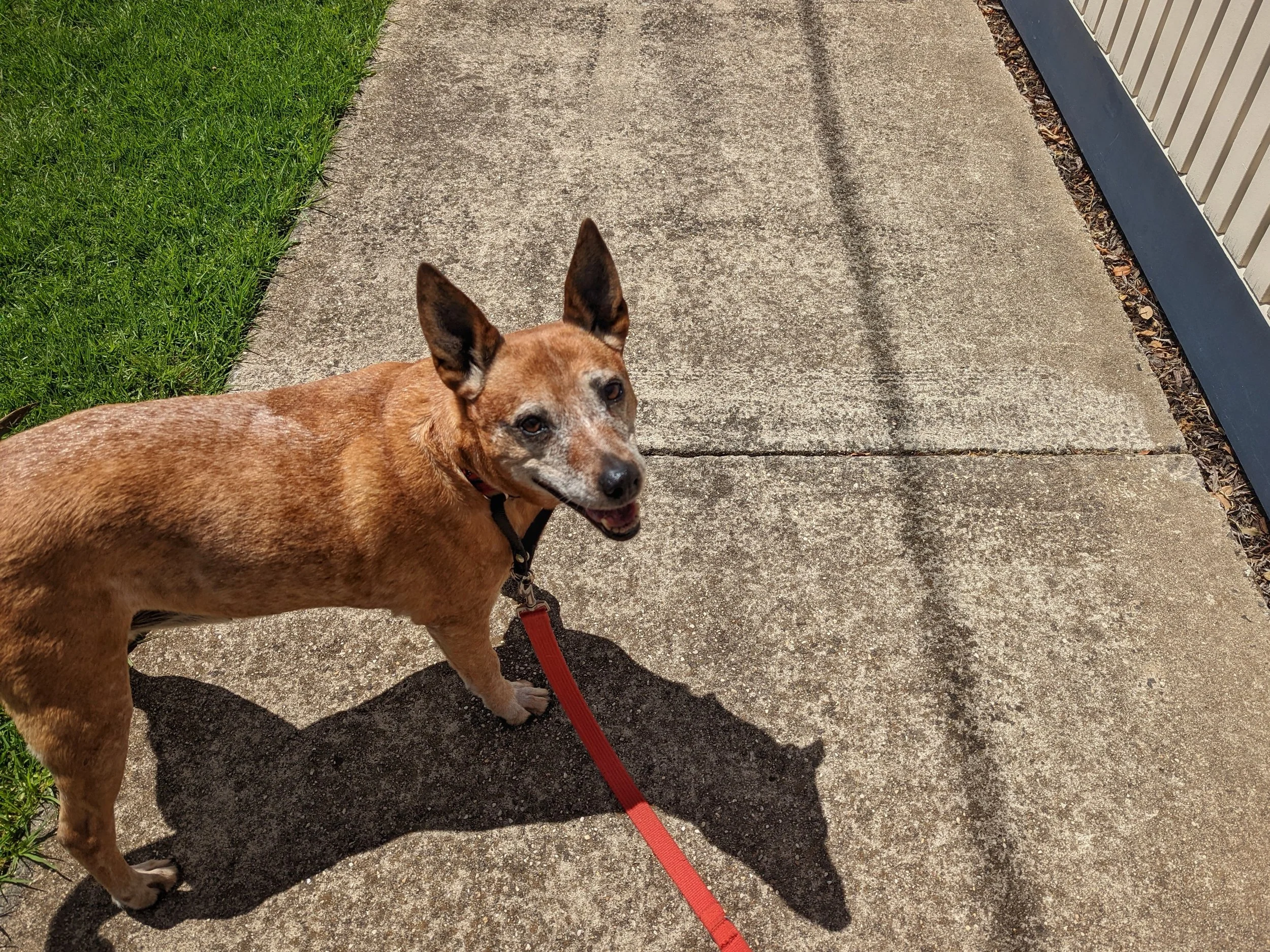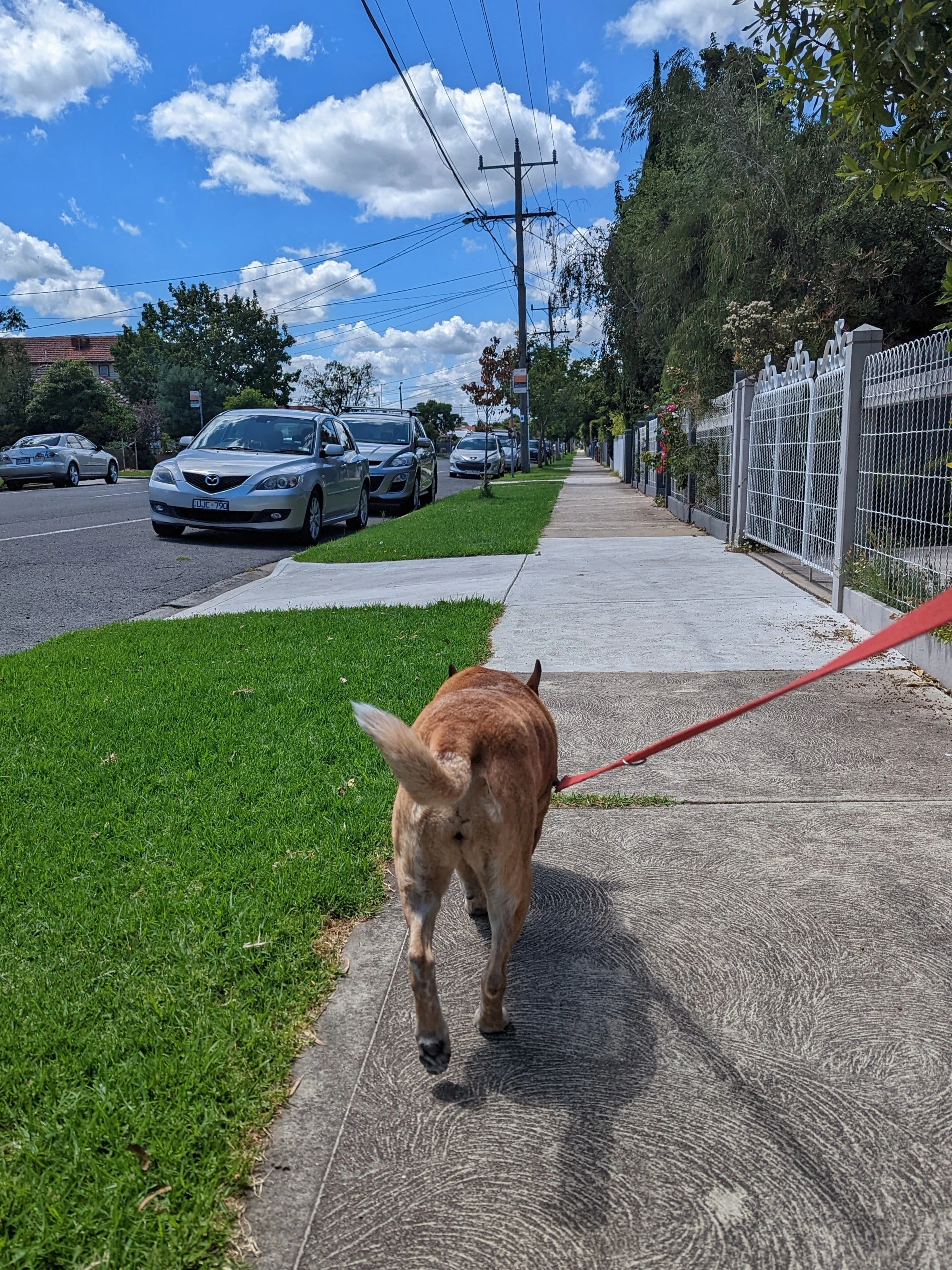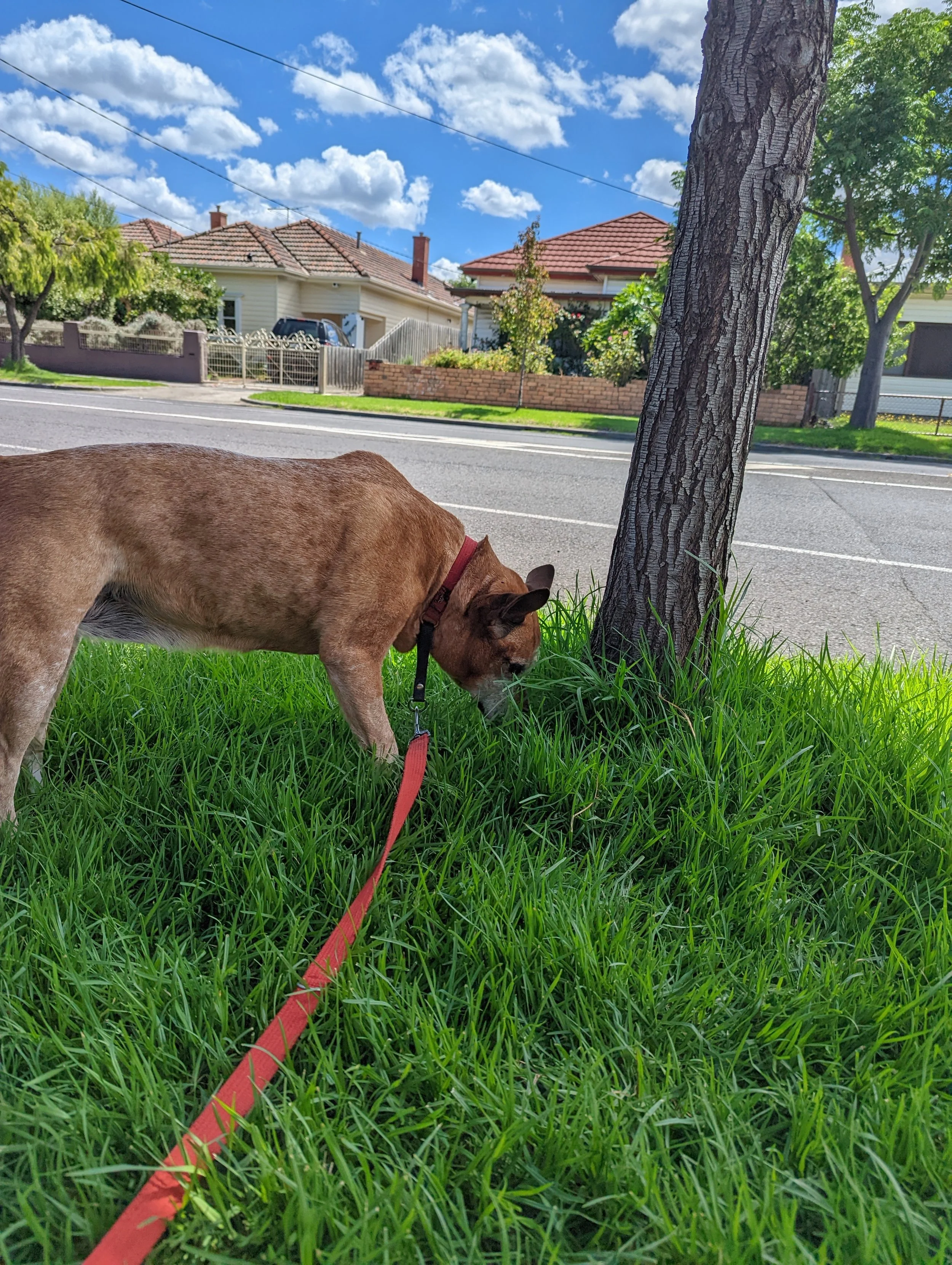 Photo of a large, brown and white dog in a park. The dog’s leash is being held be someone seated behind a tree. The dog is looking at a couple of people with a small dog who are coming down the walking path towards it.