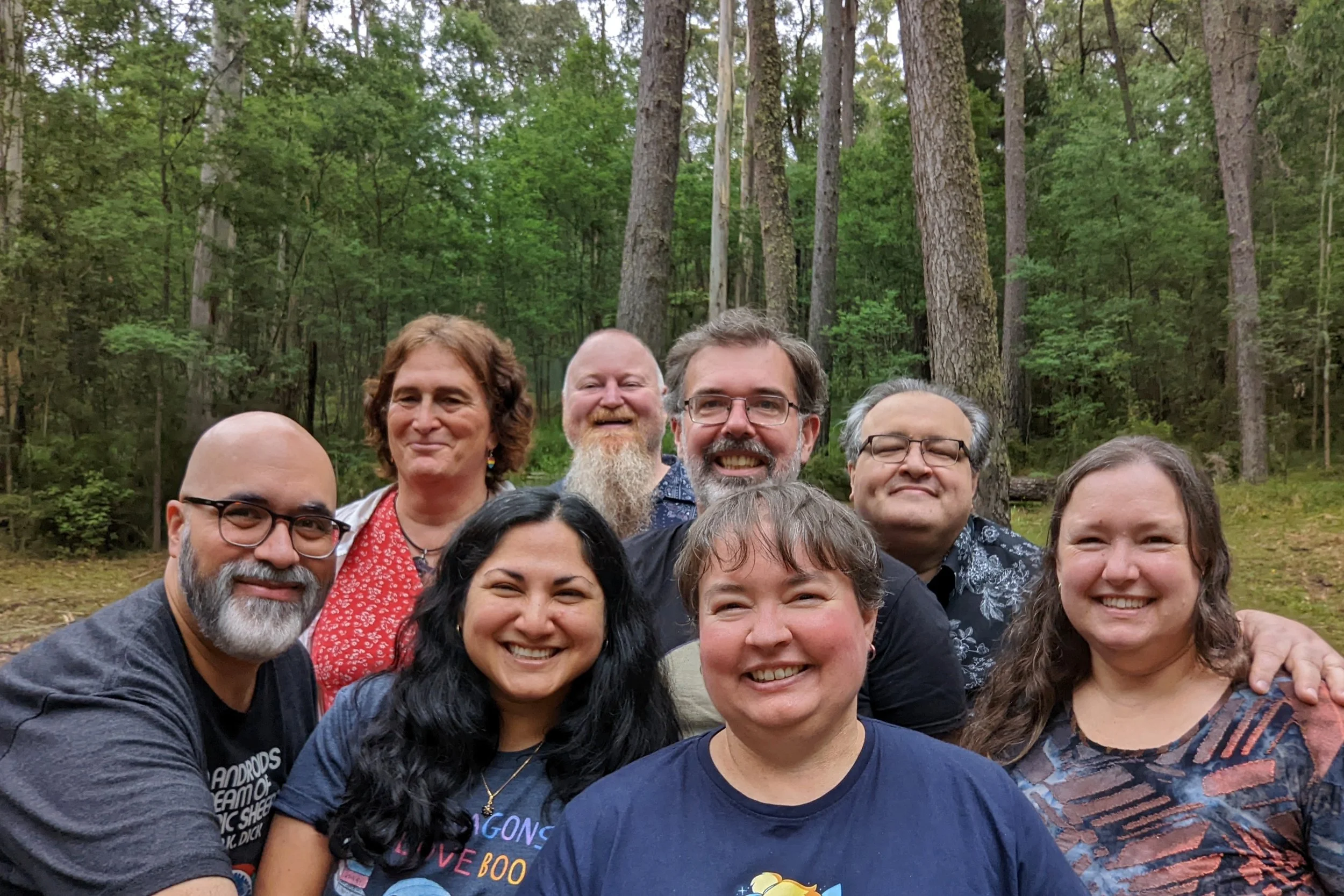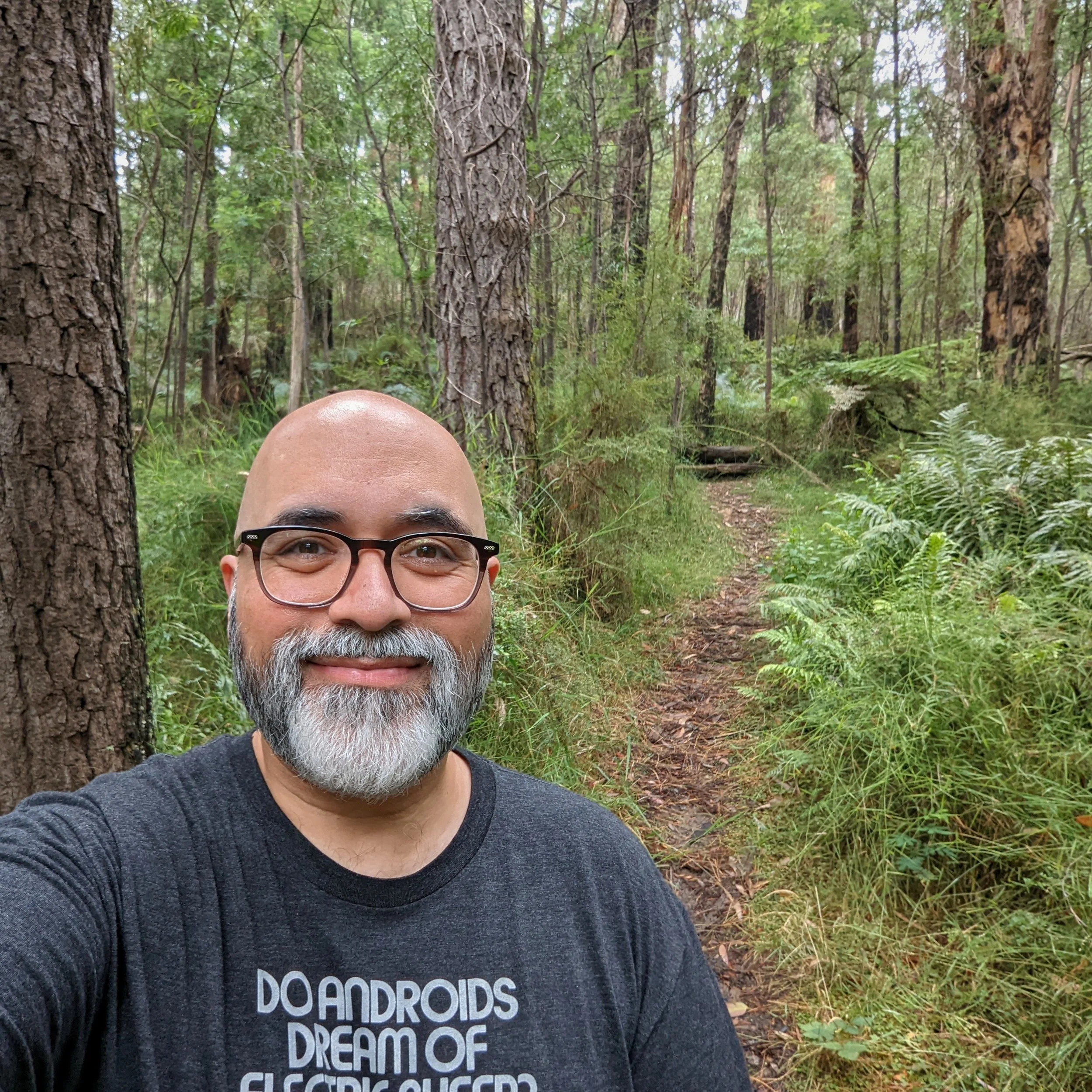 Selfie of a bald man, wearing glasses and a grey printed t-shirt. The man is standing on a walking trail in a wooded area.