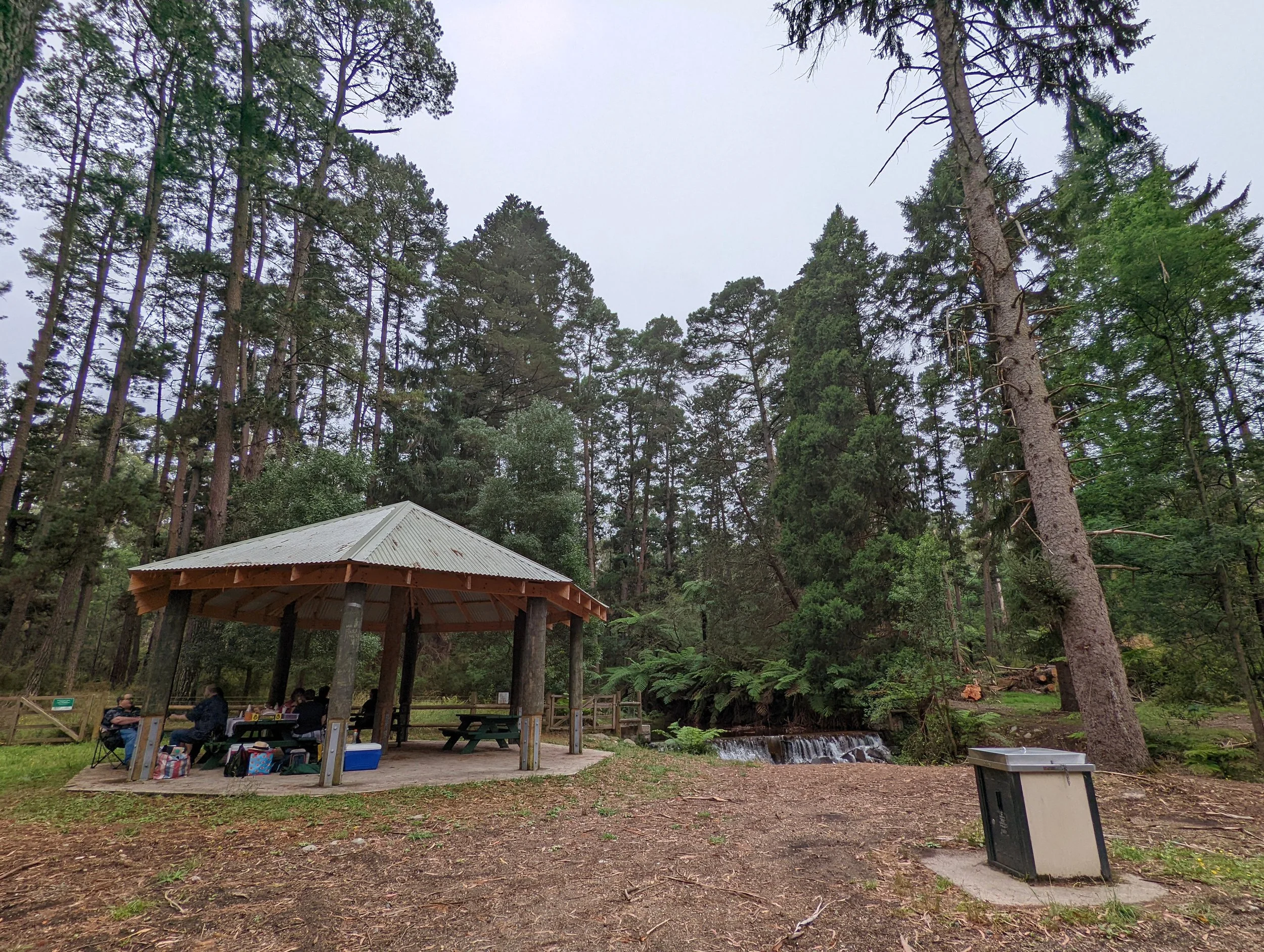 Photo of a picnic area next to a weir in the middle of a forest. A weir is a small dam built across a river to control the flow of water. The picnic area consists of a wooden gazebo with picnic tables and benches, as well as a shared barbecue.