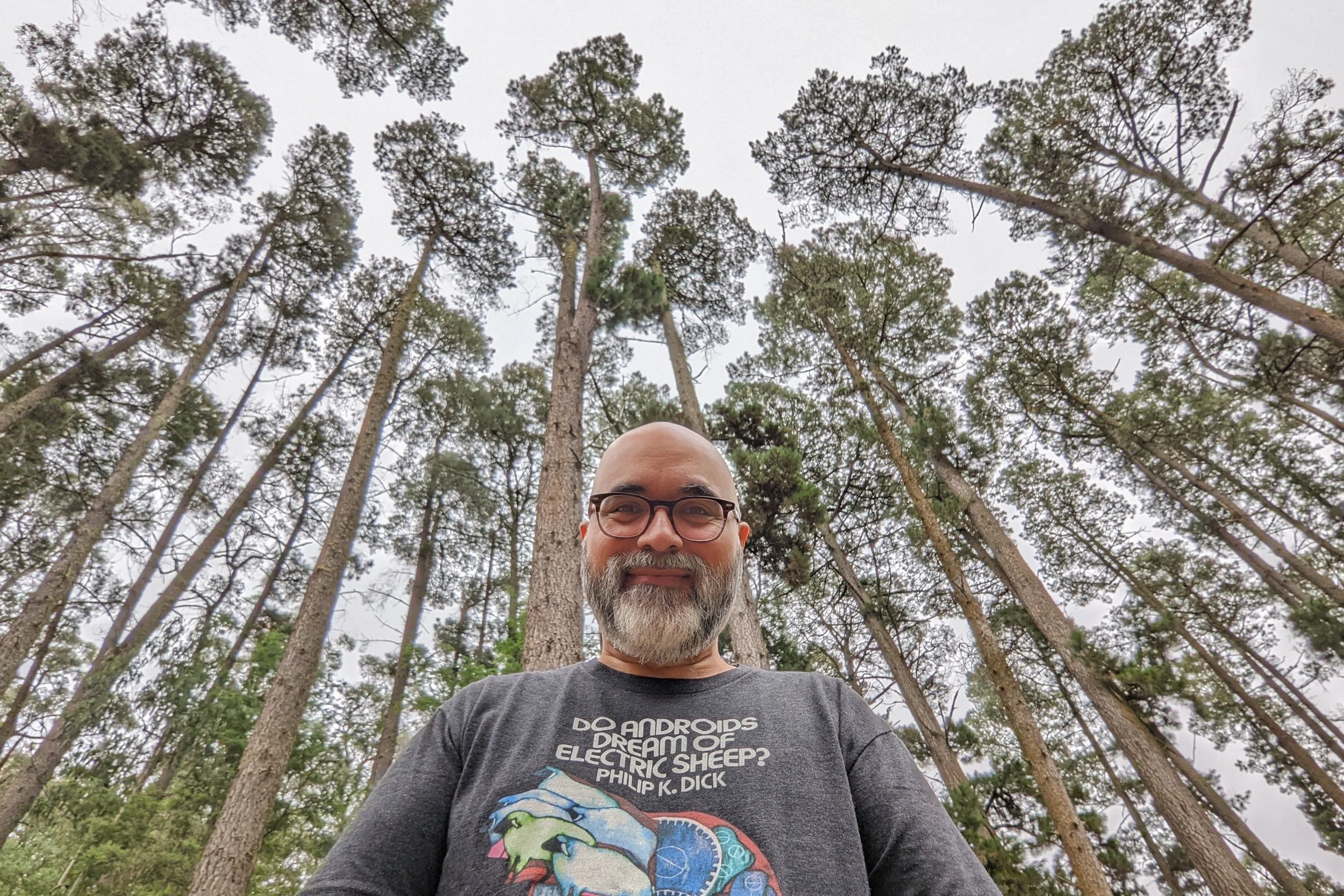 Selfie of a bald man, wearing glasses and a grey printed t-shirt standing in a wooded area. The man is looking down into a camera that is aimed towards the grey, overcast sky. Behind the man you can see the full length of the tall trees that surround him.