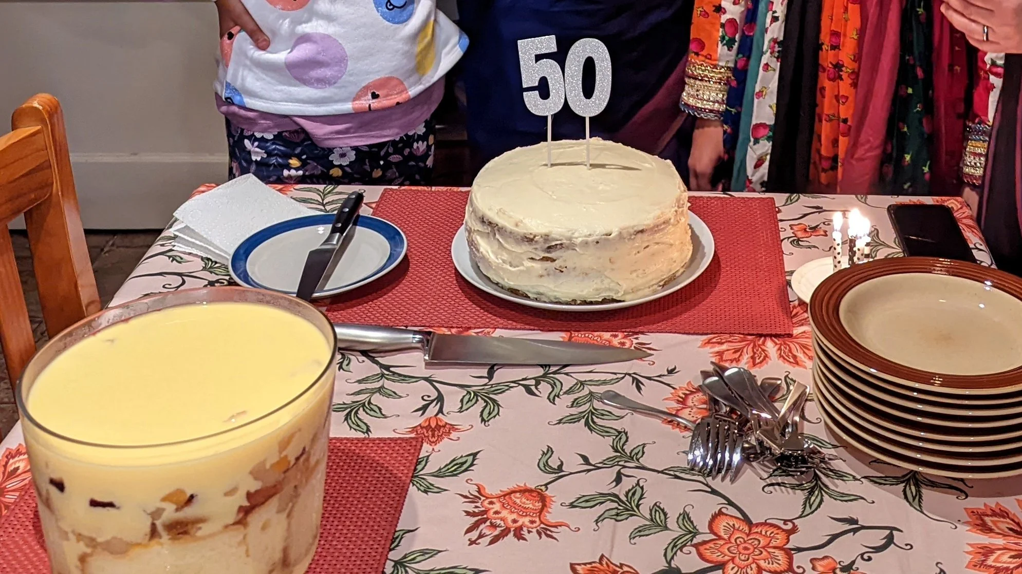 Photo of a dining table (with a flowery table cloth) around which people are standing. On the table is a large cake with rustic cream cheese frosting and the numbers 5 and 0 stuck on top of it. Also on the table is a trifle bowl containing fruit trifle that’s topped off with vanilla custard.