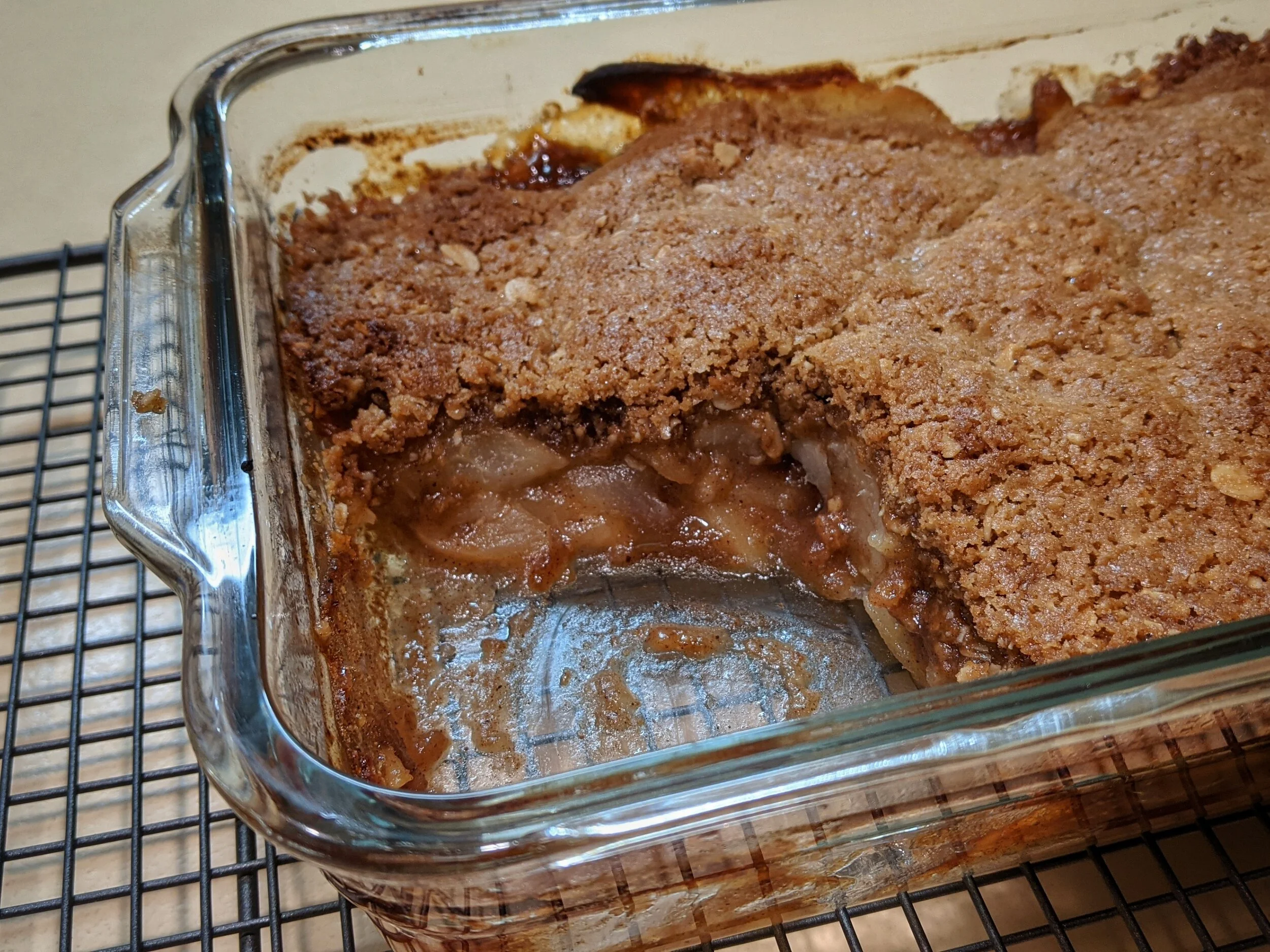 Photo of a baked pear dessert with one portion scooped out. The dessert consists of several layers of cooked pears underneath a golden-brown crunchy top layer.