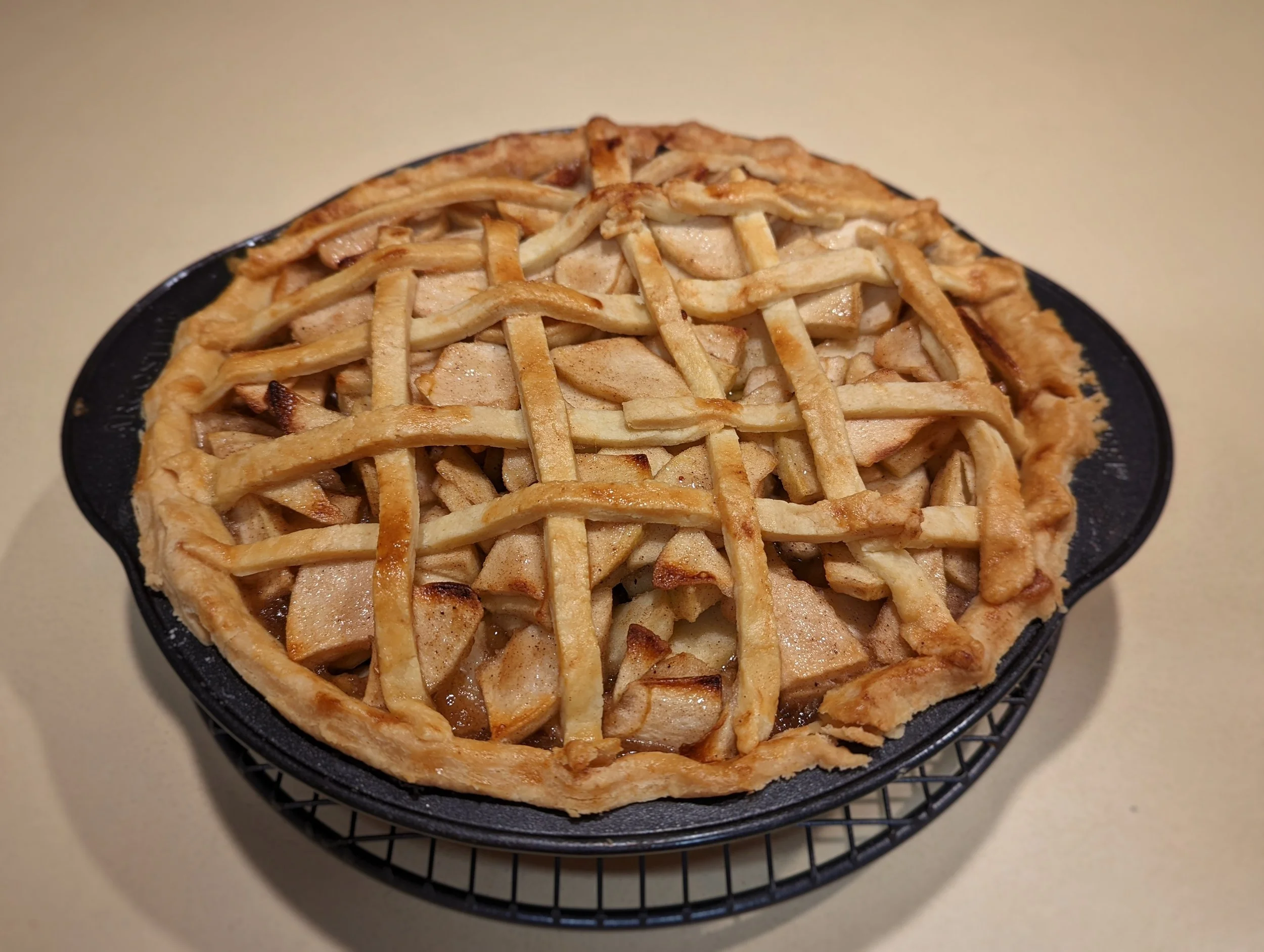 Photo of an apple pie cooling in a pie dish that’s been placed on a wire rack. This is an open pie with a sparse pastry lattice on top.