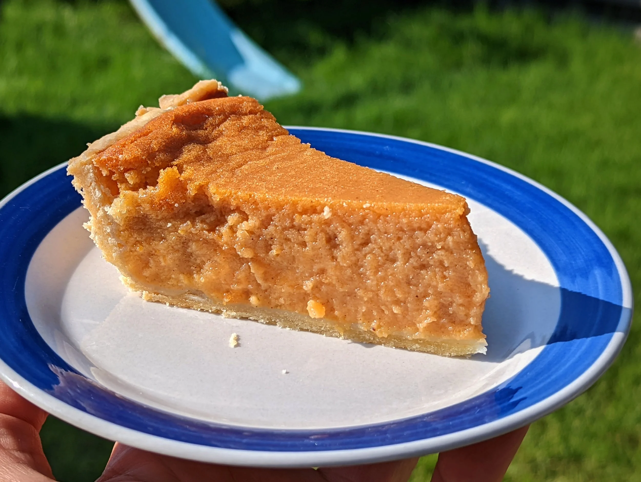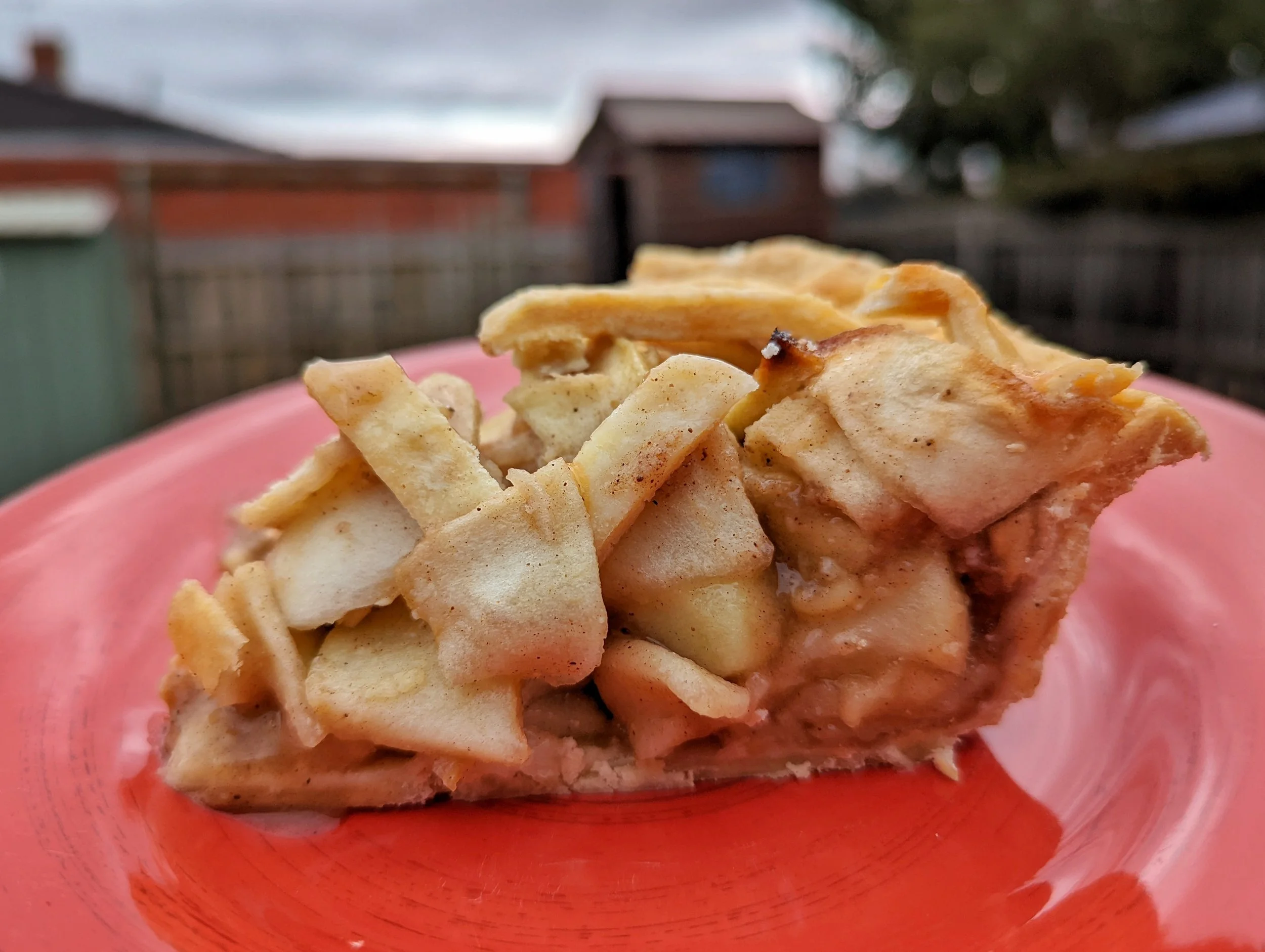 Photo of a large slice of apple pie on a red coloured plate that’s being held up outdoors.