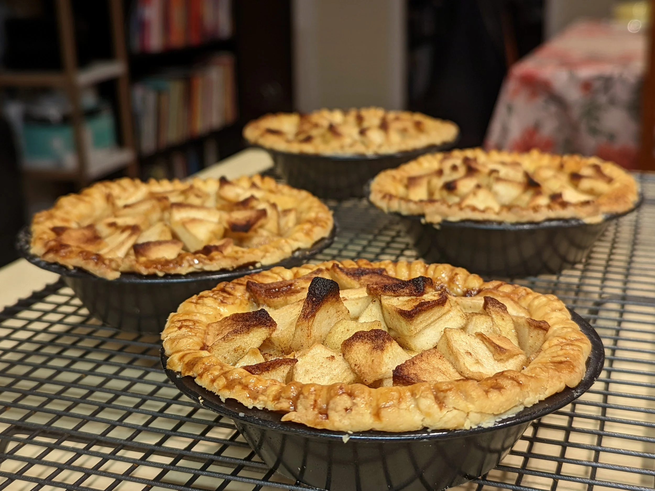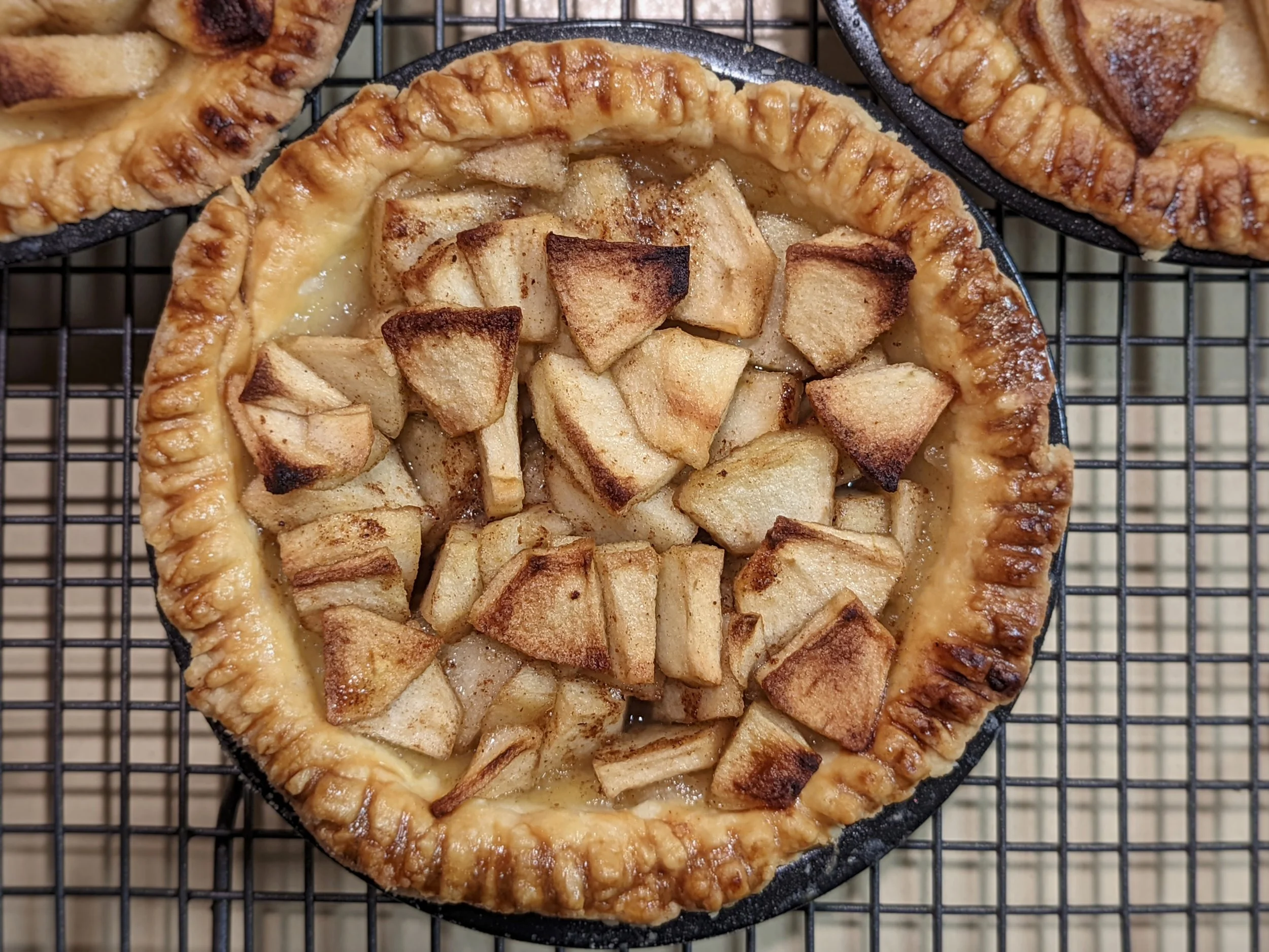Close up photo of a mini open apple pie with crispy, caramelised apples and a nicely browned crust. This pie is lying on a cooling rack, along with a couple of adjacent mini pies.