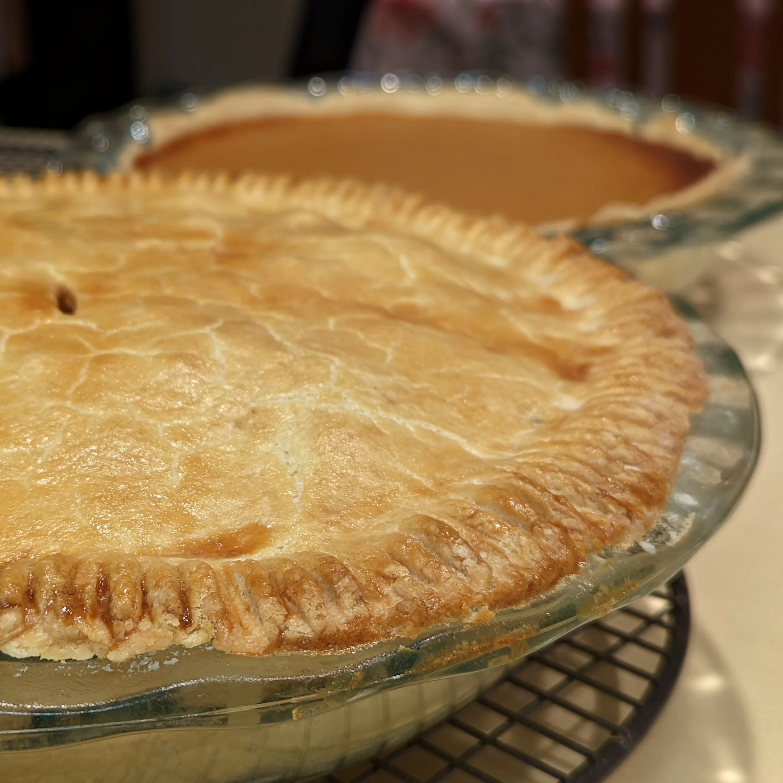 Close up photo of an apple pie cooling on a rack. Behind the apple pie, and slightly out of focus, is a sweet potato pie.
