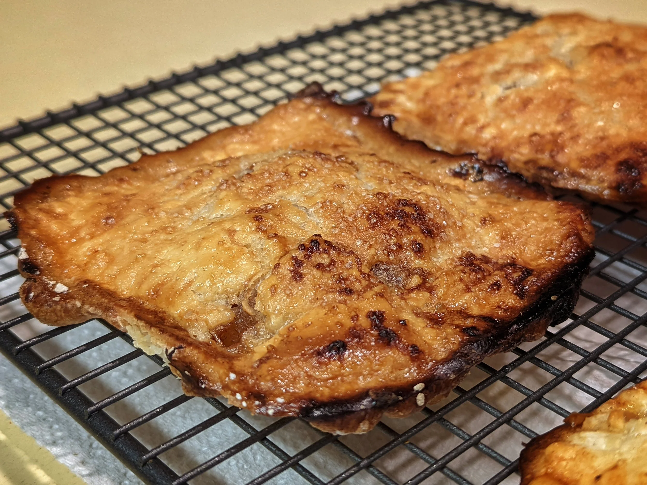Photo of a few square, single-serve apple pies with a rich, brown, caramelised crust lying on a cooling rack.