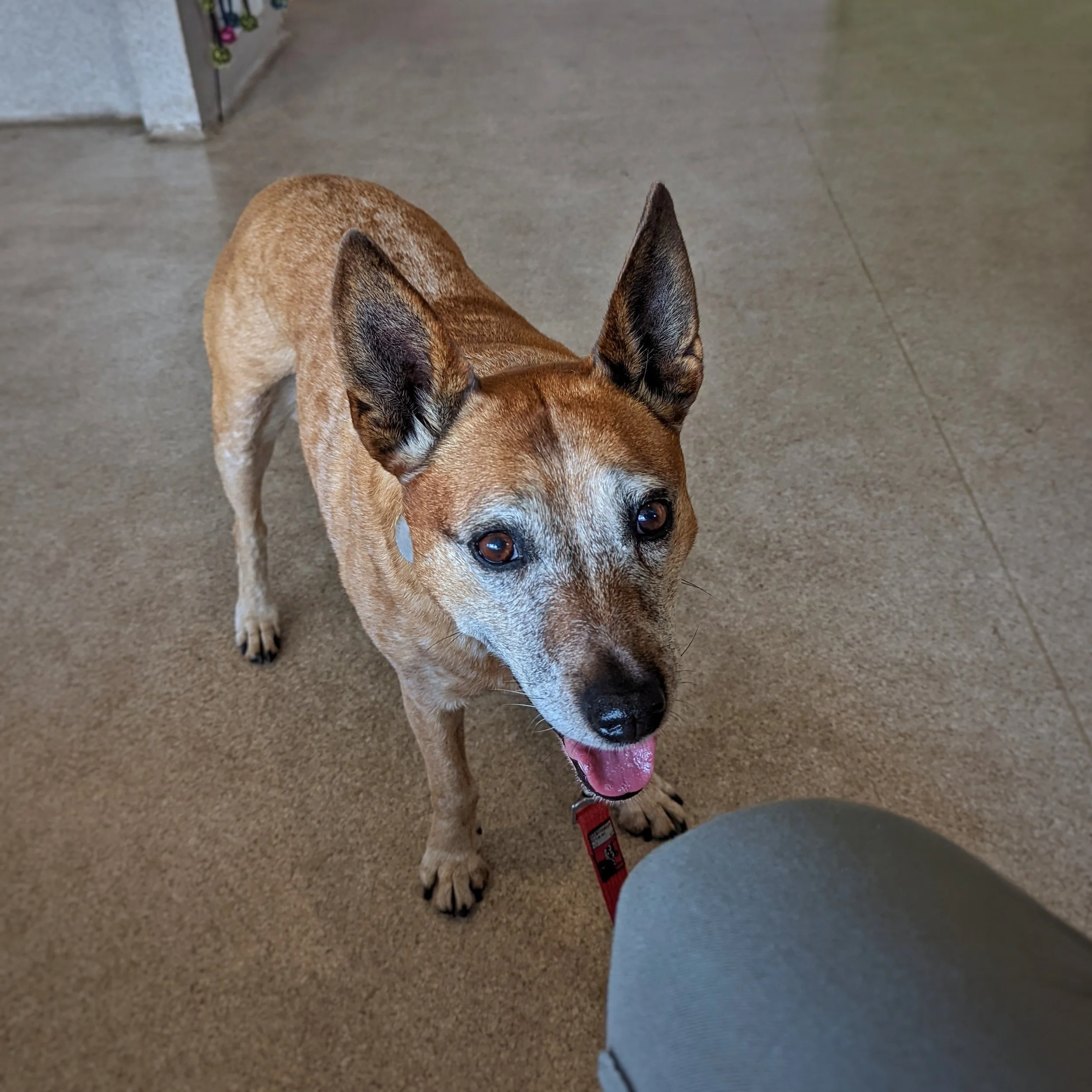 Photo of a red/brown dog standing in a large waiting area, looking up at the photographer. The dog’s mouth is open because she’s panting and her ears are pulled back slightly from the typical alert position. She looks a little stressed.